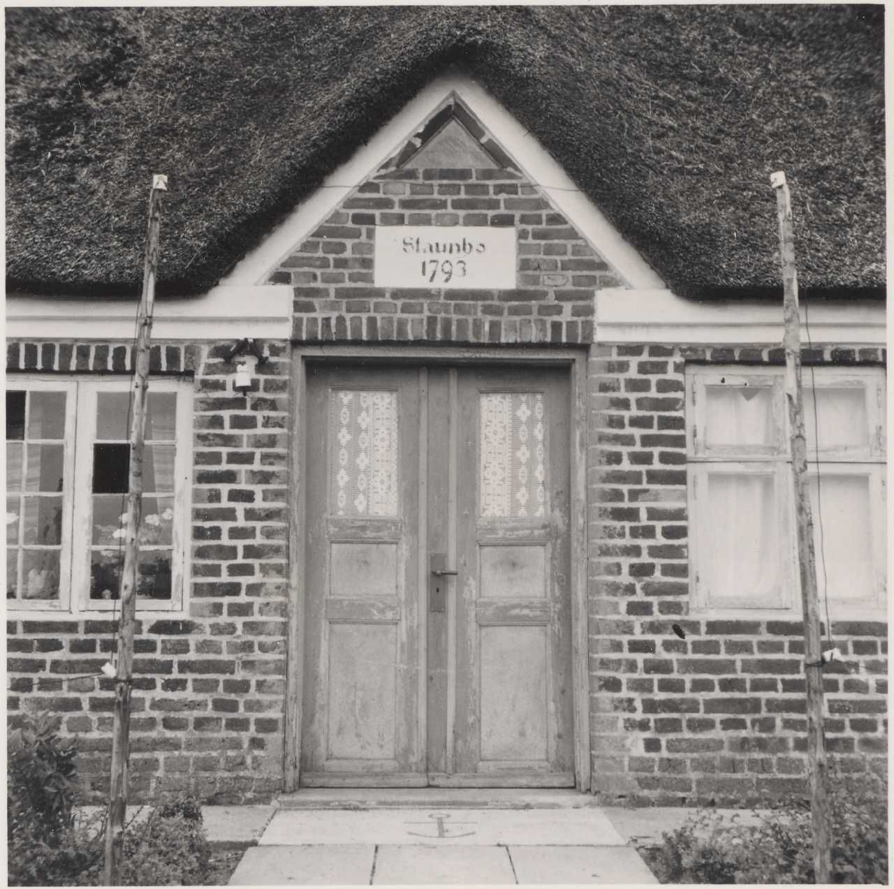 Maskingenkendt tekst fra arkivkort. Staunbo", tilhører Hans Marinus Nielsen. Kvist over indgangsdøren på husets østside. 0.H.fot. maj 1946.
