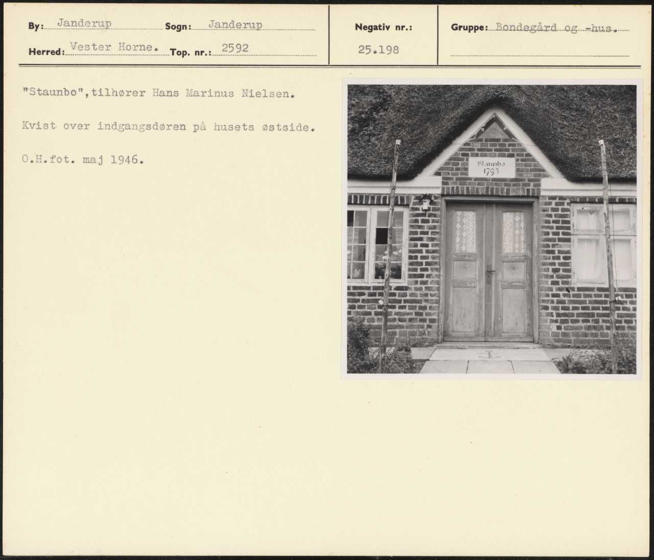 Maskingenkendt tekst fra arkivkort. Staunbo", tilhører Hans Marinus Nielsen. Kvist over indgangsdøren på husets østside. 0.H.fot. maj 1946.