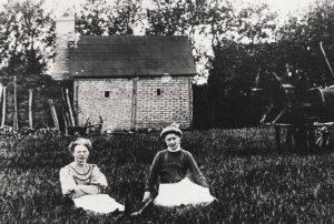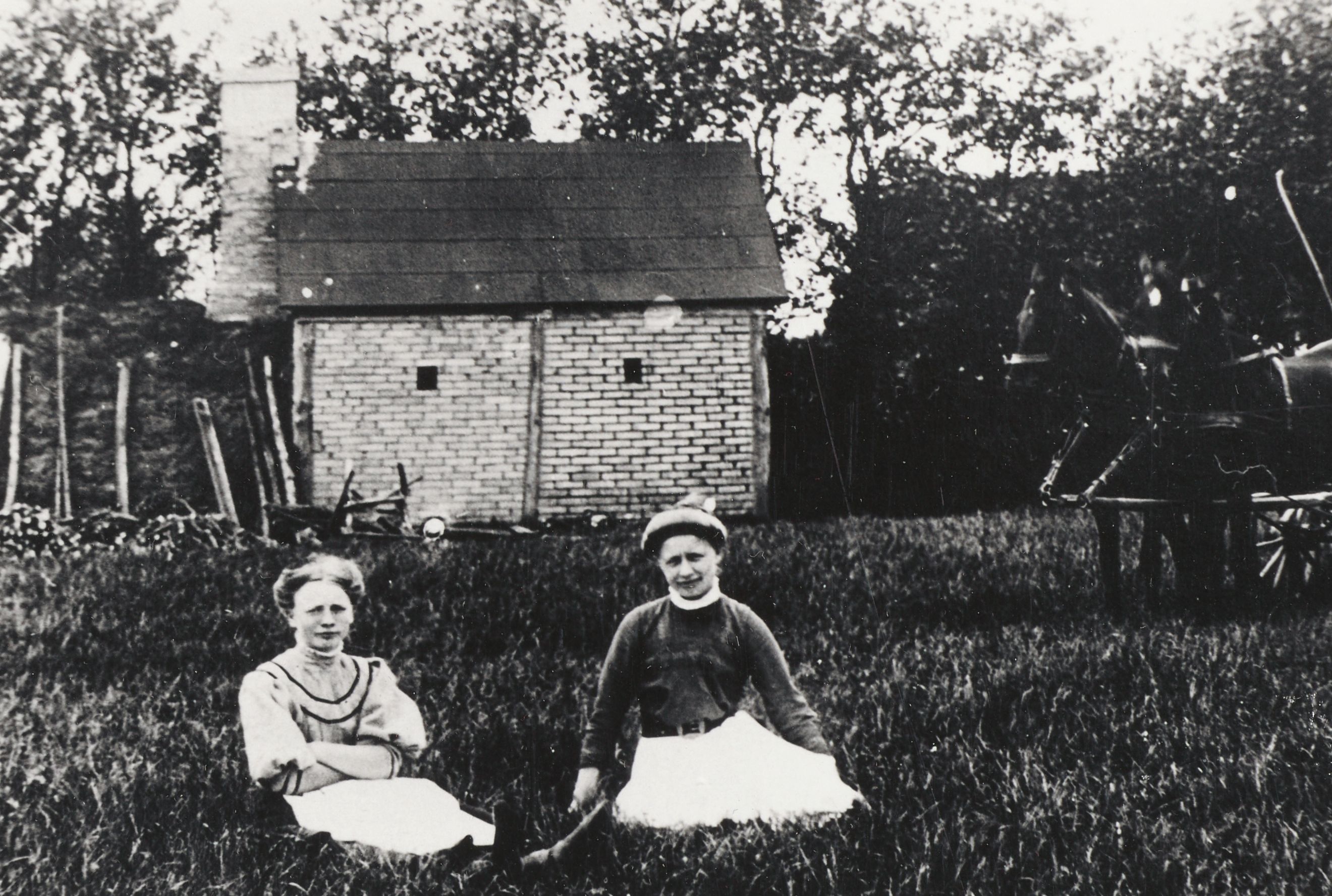 Maskingenkendt tekst fra arkivkort. Fritliggende ovnhus med jordoverdækket ovn, ved husmands- stedet matr. 4 a af Nr. Hebo, Hyllerslev. Stedet tilhørte Kristen Jørgensen Pedersen, f. 1851 i Hunderup. Fot. ca. 1912 (udsnit). Personerne fra venstre: Agnete Jørgensen Pedersen, f. 28/8 1898, Petra Jørgensen Pedersen, f. 21/11 1884. Foto skænket af: Politiassistent Knud Jensen Nygade 47 6330 Padborg. Brevjournal nr. 278/73 Un 14,1-307