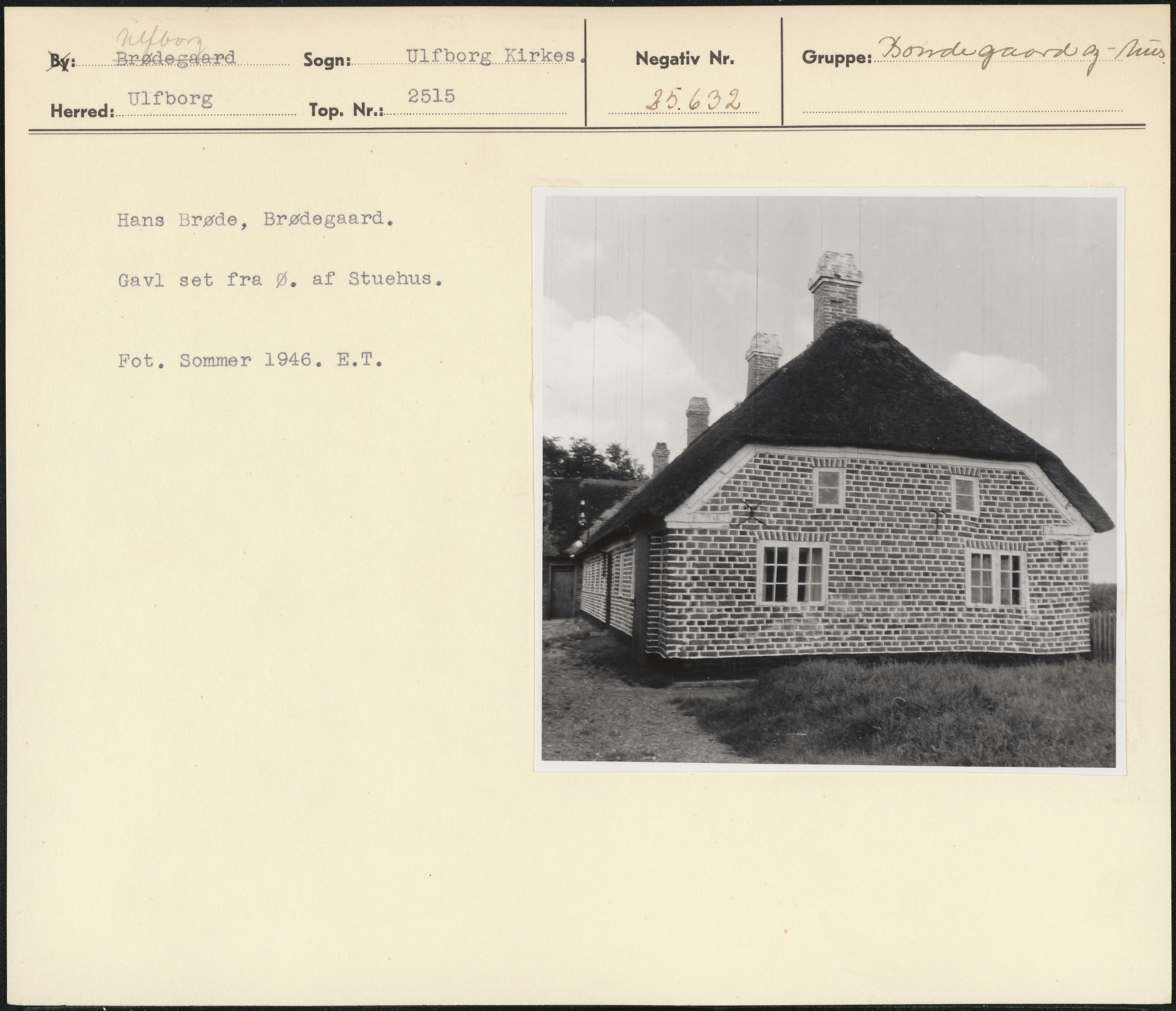 Maskingenkendt tekst fra arkivkort. Hans Brøde, Brødegaard, Gavl set fra Ø, af Stuehus, Fot, Sommer 1946, E.T.