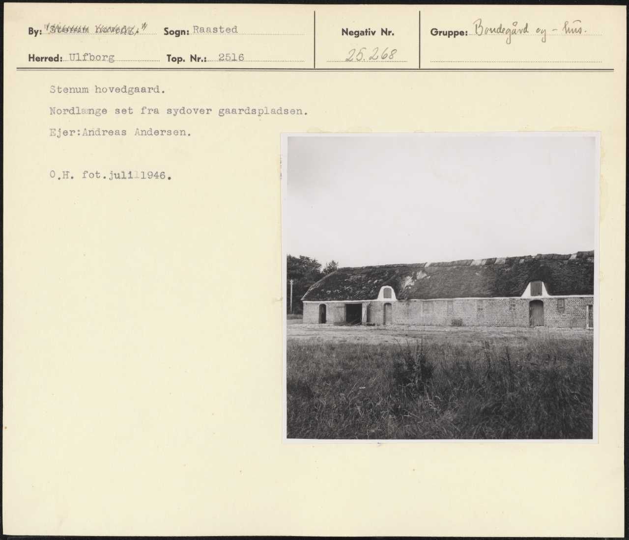 Maskingenkendt tekst fra arkivkort. Stenum hovedgaard; Nordlaænge set fra sydover gaardspladsen- Ejer:Andreas Andersen. 0,H. fot.jul4i:1946,
