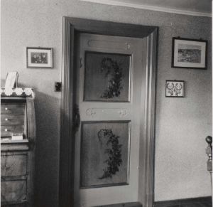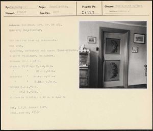 Maskingenkendt tekst fra arkivkort. Andreas: Petersen. Art. Nr. 54 mfl. Sønderby køgeltønder. Dør me llem Stue og Soveværelse mod Vest. lysedrun, mørkebrun med nyere 5låmsterranke, 2 store Fyldinger, en mindre. karmens bBr: 0,13 m. Øverste Fyldings H) 0,55 m. " " Br: 0,55 m. nederste " Br.X: 0,55 m. " " H.8R: 0,70 m. Dørens H: 1,78 m. Br: 0,78 m. midterste lvyleing: 0,45 m. x 0,1o m. Fot. I.F.M. Sommer 1947, Jvnf. NEU kr. € 778