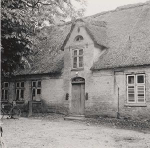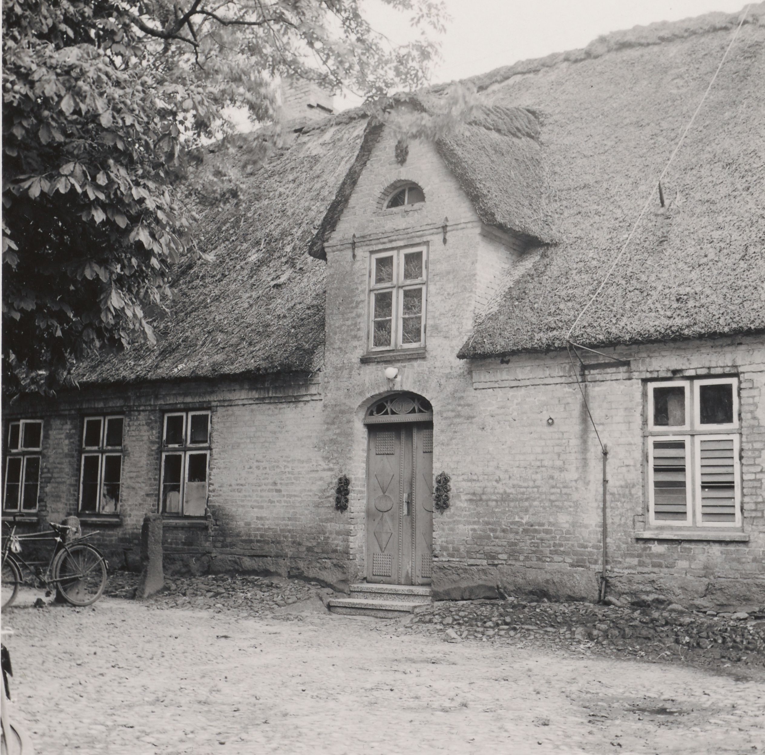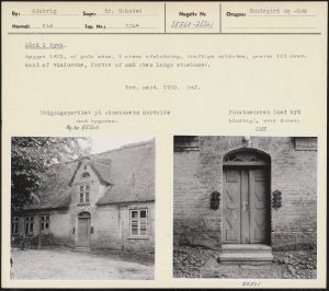 Maskingenkendt tekst fra arkivkort. Gård i byen. Bygget 1829, af gule sten, 1 stens afslutning, kraftige syldsten, gesims til over- kant af vånduerne, fortov af små sten lengs stuehuset. Fot. sept. 1950. BSvJ. Indgangspertiet på stuehusets nordside Forstuedøren (med nyt mod bygaden. håndtag), over døren: ly I. SS860. CUT, 3556