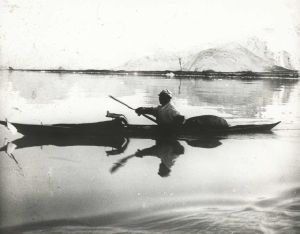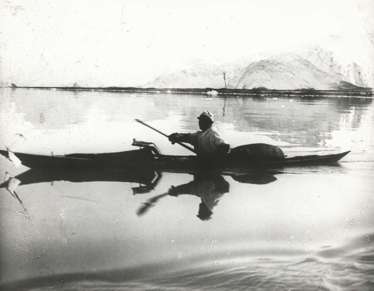 Original tekst til billedet er: "Kajakmand. Kajakken er forsynet med Skydesejl og Bøssepose. (Dr. phil. Harder fot.)" og findes i "Fortegnelse over en Serie Lysbilleder fra Grønland". Fotografen er formentlig geologen Poul Jesper Harder (1878-1931). Billedet stammer fra "En Serie Lysbilleder fra Grønland", hvor alle er udvalgt af lektor i geografi Sophie Petersen (1885-1965). I serien er i alt 38 billeder i sort-hvid. Label er påsat dias med teksten: "Foto-Magasinet, A-S. Frederiksborggade 7. Ser. G. Nr. 22". Dias måler ca. 8x8 cm.