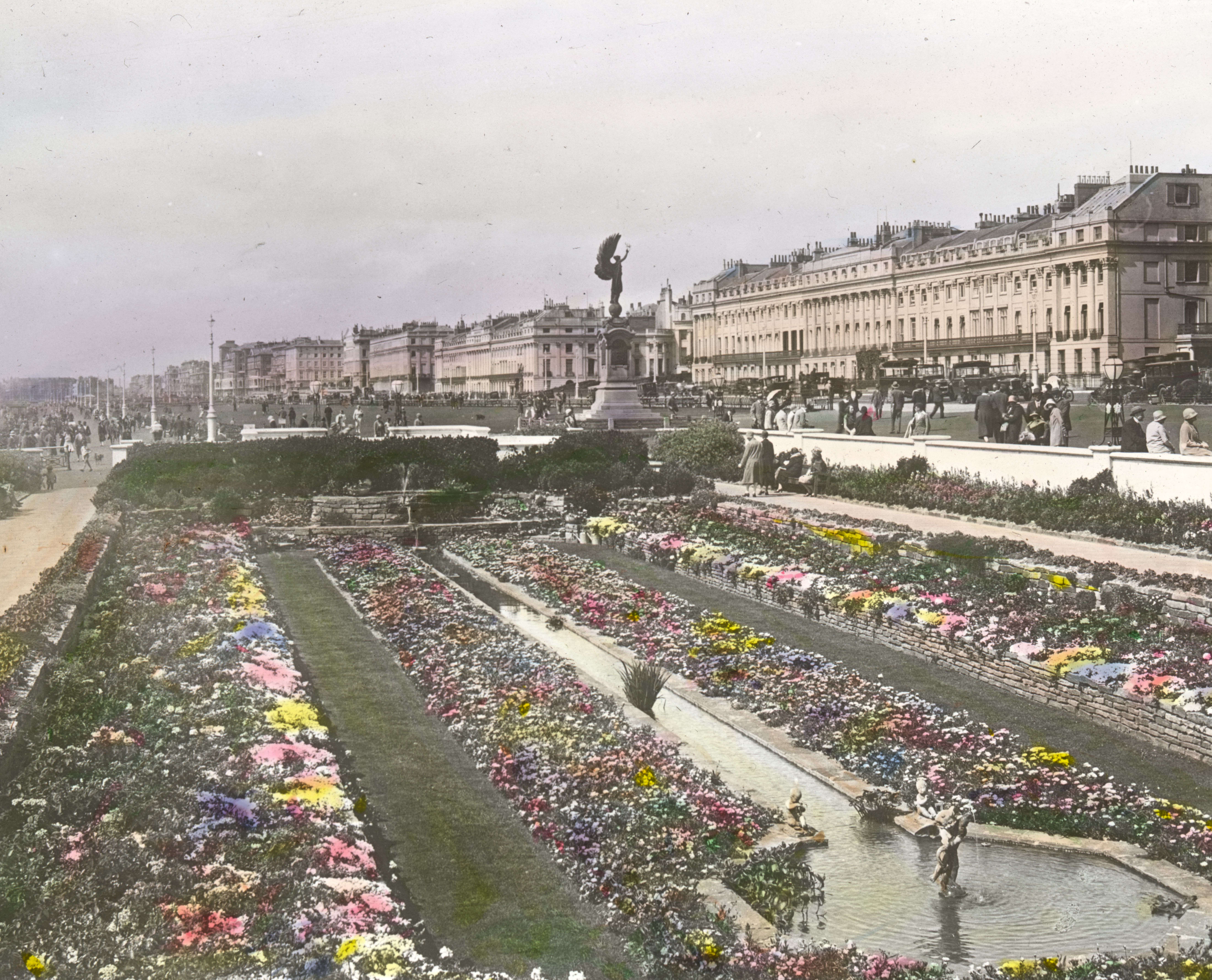Billedet er håndkoloreret og stammer fra lysbilledserie benævnt: "Serie England paa Kryds & Tværs". I serien er 84 lysbilleder. På dias er påsat labels: "V. Richter. København." og "53. Fra et engelsk Badested". Firmaet V. Richter producerede, kuraterede og distribuerede lysbilledserier i primært 1920'erne og 1930'erne. Dias måler ca. 8 x 8 cm.