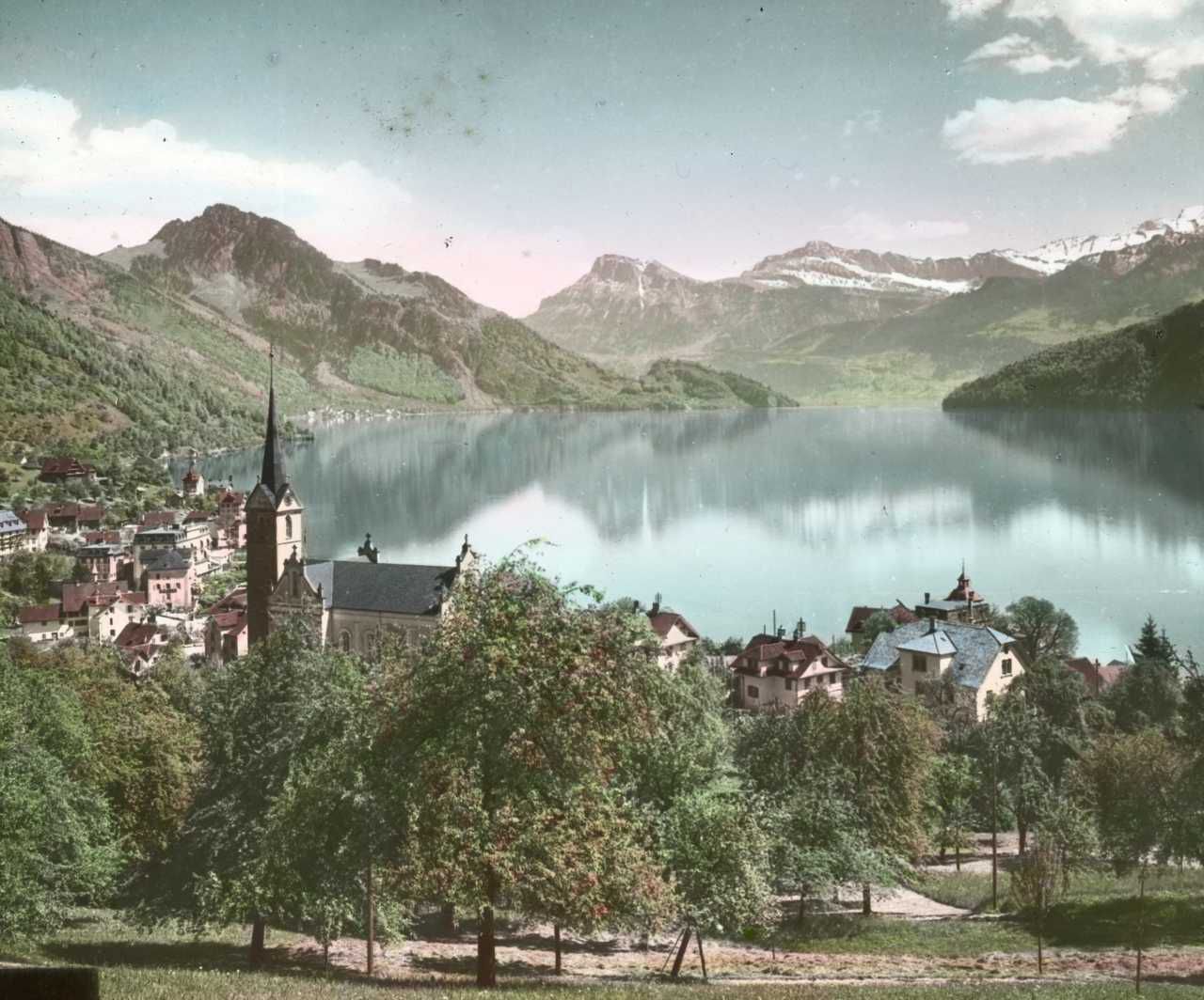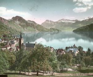 Billedet er håndkoloreret og stammer fra lysbilledserie benævnt: "Rhinrejse fra Køln til Schweiz". På dias er påklæbet labels: "V. Richter. København." og "28 Luzern. Udsigt o. Vierwaldstädtersøen [sic]". I serien er 50 lysbilleder. Håndskrevet fortegnelse medfølger; i denne har pågældende billede nr. 28, samt titlen: "Luzern: Vierwaldstättersøen". Firmaet V. Richter producerede, kuraterede og distribuerede lysbilledserier i primært 1920'erne og 1930'erne. Dias måler ca. 8 x 8 cm.