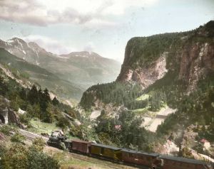 Billedet er håndkoloreret og stammer fra lysbilledserie benævnt: "Rhinrejse fra Køln til Schweiz". På dias er påklæbet labels: "V. Richter. København." og "45 Dazio grande ved St. Gotthardbanen". I serien er 50 lysbilleder. Håndskrevet fortegnelse medfølger; i denne har pågældende billede nr. 45, samt titlen: "Dazio Grande v. Gotthardsbanen". Firmaet V. Richter producerede, kuraterede og distribuerede lysbilledserier i primært 1920'erne og 1930'erne. Dias måler ca. 8 x 8 cm.