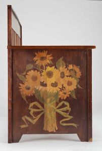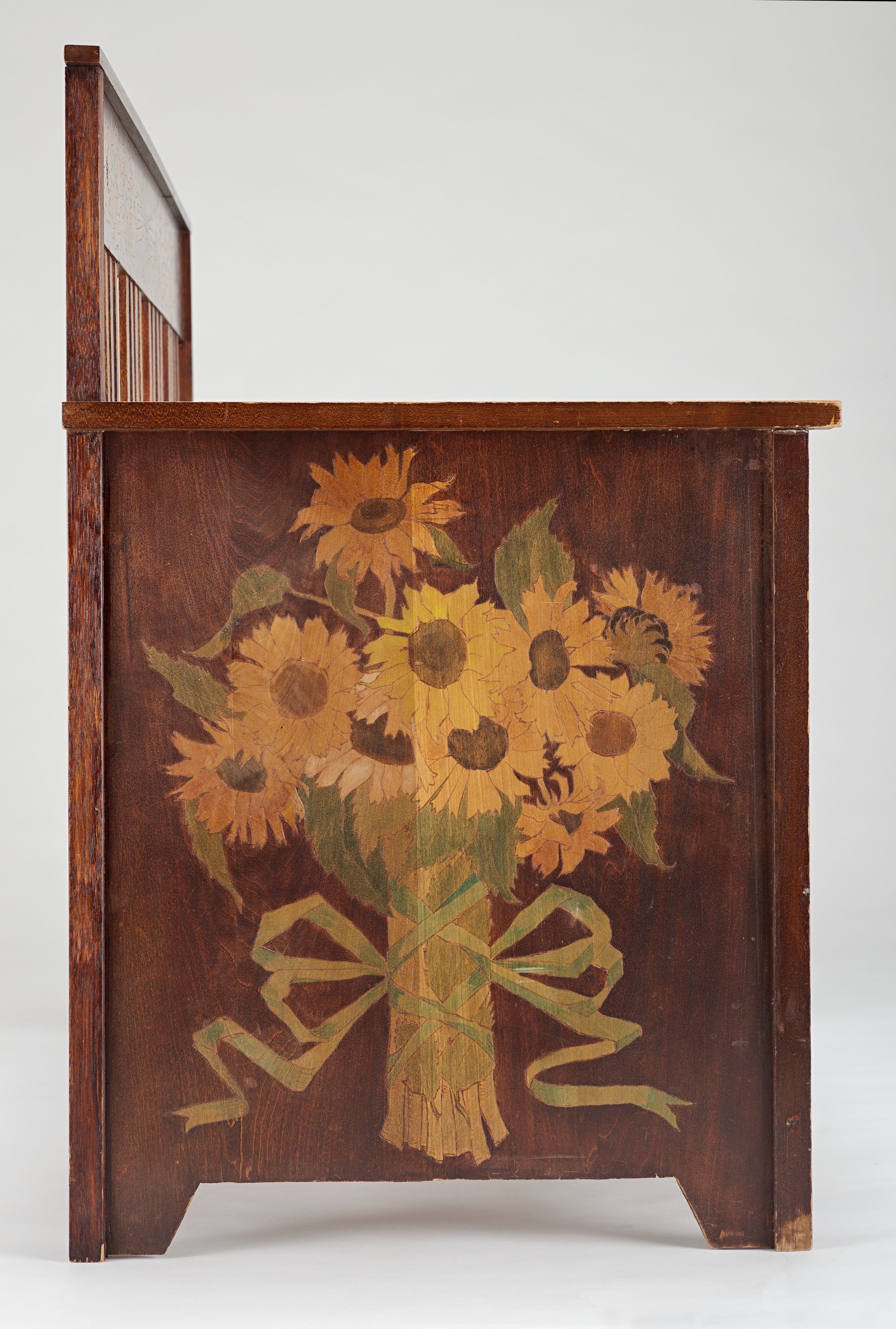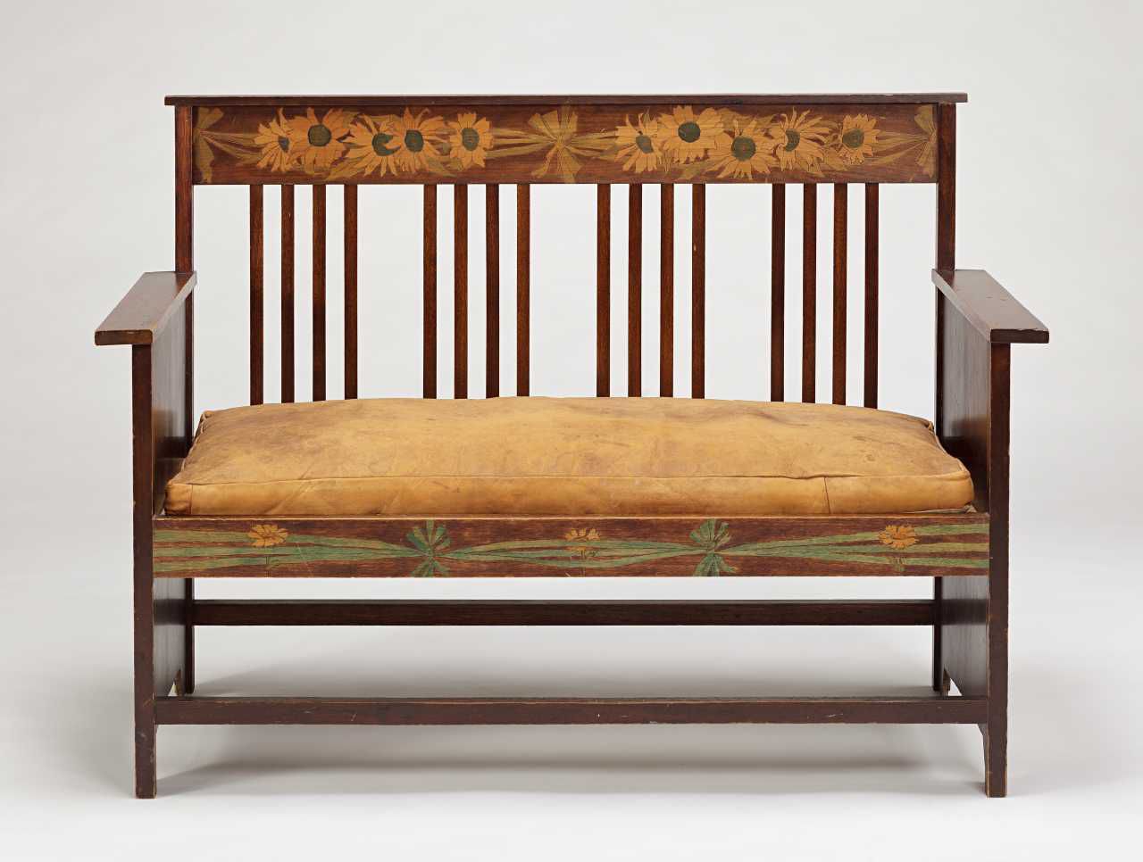 To-personers sofa af bejdset fyrretræ med solsikkedekoration. På sædet brun skindhynde. Tegnet af Marie Krøyer. Overdraget til Skagens Museum i 2024.