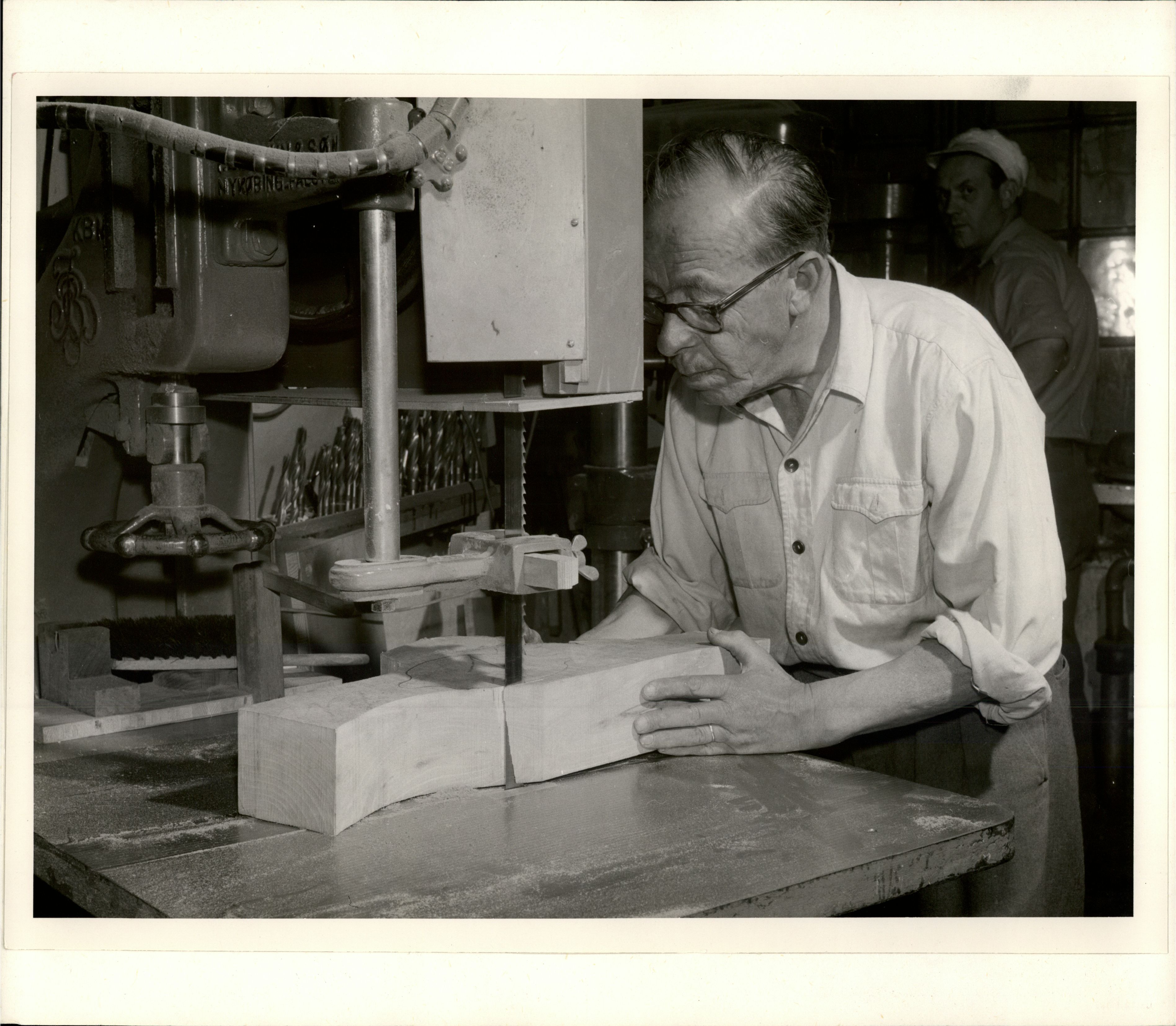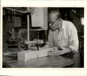 Billedskærer Arne Scherling (1893–1966), oldermand for billedskærerlauget, arbejder i sit værksted, Bredgade 36 (nu nedlagt). Foto ca. 1940. Billedserie skænket 20/10 1992 af enken, Else Scherling - boende i Gartnerboligen i Sorgenfri, senere "Møllebo" - ved fru V.Heine, Lottenborgvej 17, Lyngby. J. nr. 269/92. Kort 1 af 10 kort.