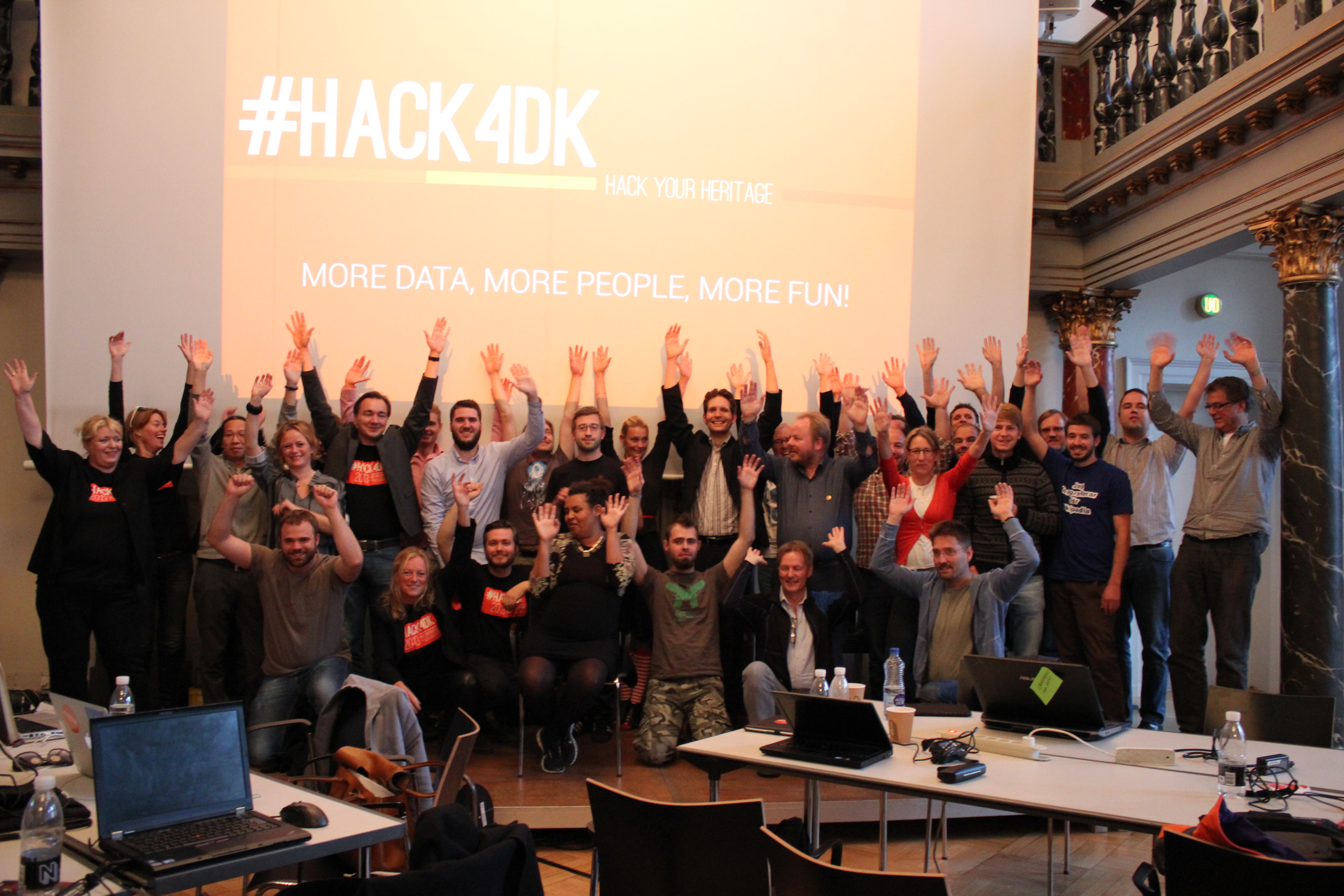 Billede af deltagere ved #HACK4DK 2013. Arrangementet afholdtes i Nationalmuseets festsal i Prinsens Palæ. Se evt. http://hack4.dk/
