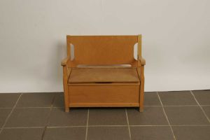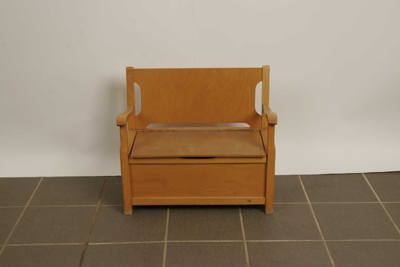 Slagbænk i børnestørrelse. Er blevet anvendt i børneinstitution og er del af større indsamling af børnehaveinventar fra 1970'erne og 1980'erne foretaget i 2012. Fotografiet er et registreringsfoto.