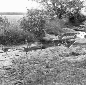 Prøveopstilling med lokkegæs (knortegæs) ved Ludvig Stoklunds ejendom i Bangsbo. Jvf. Nationalmuseets Etnologiske Undersøgelser (NEU) nr. 2578.