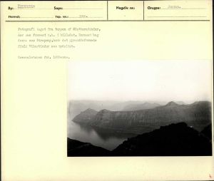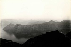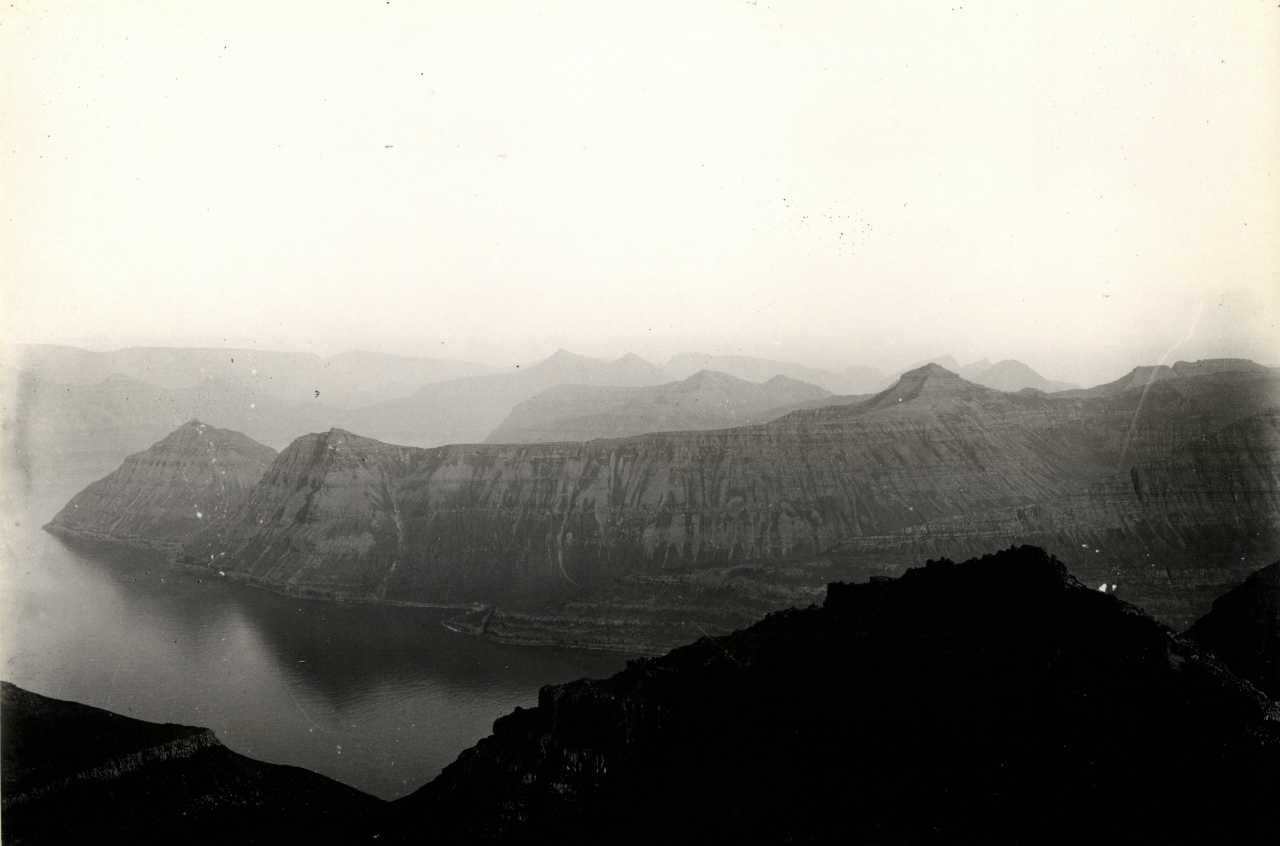 Fotografi taget fra toppen af Slattaratindur, der ses forrest til højre i billedet. Nærmest bag denne ses Strømø, hvor det pyramideformede fjeld Vikartindur ses tydeligt. Foto: Generalstabens Topografiske Afdeling 1890erne.
