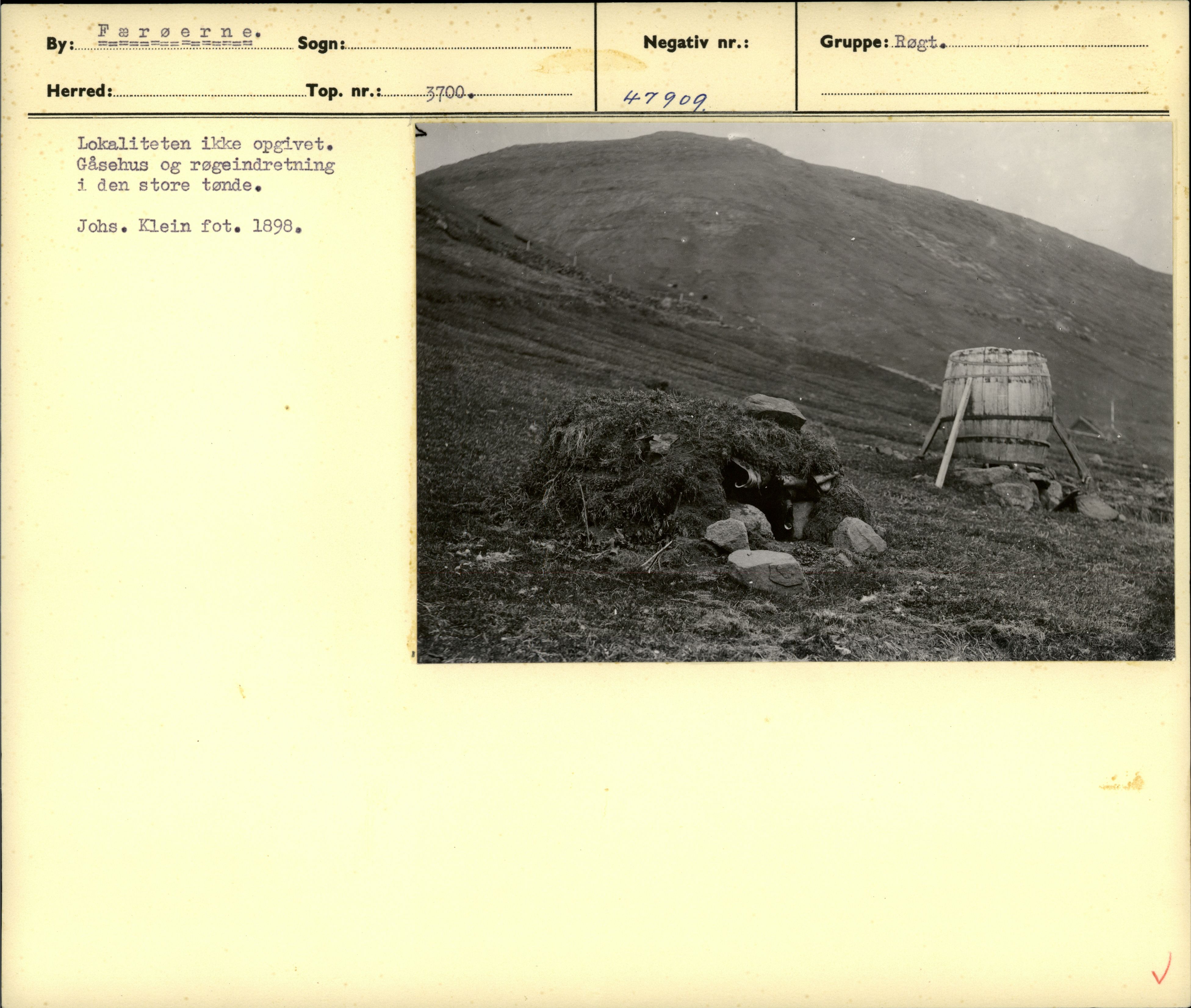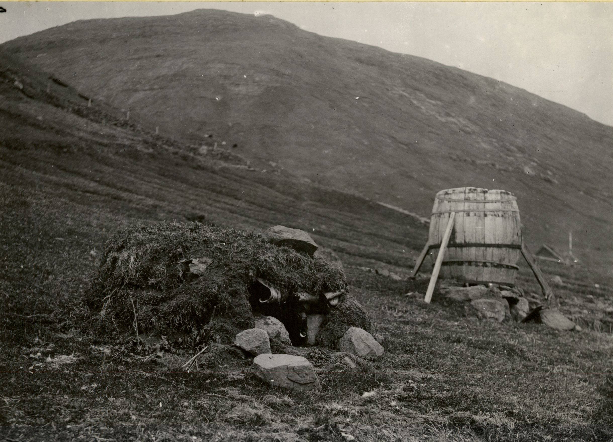 Gåsehus og røgeindretning i den store tønde. Lokaliteten ikke opgivet. Foto: Johannes Klein 1898.