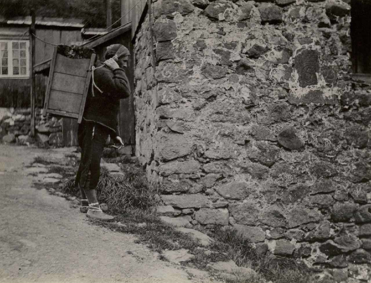Mand, der bærer tørv i leypur (færøsk bærekasse), Han står ved gamle huse i Tinganes. Foto: Generalstabens Topografiske Afdeling 1890'erne.