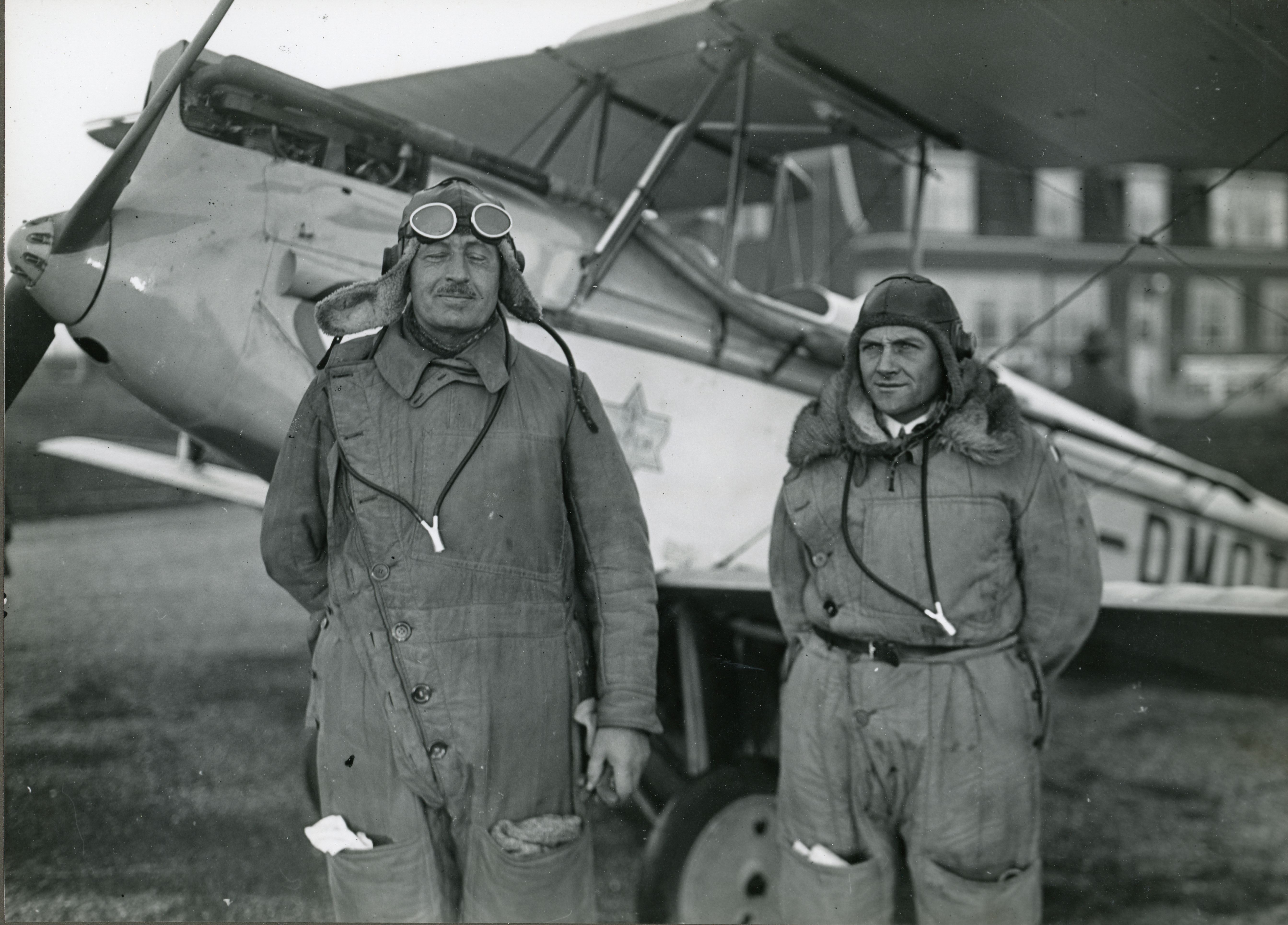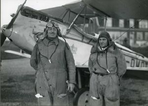 Direktør Theilst (t.v.) og Militærflyveren sergent H.I.M. Jensen, fotograferet ved Kastrup Lufthavn, 1929.