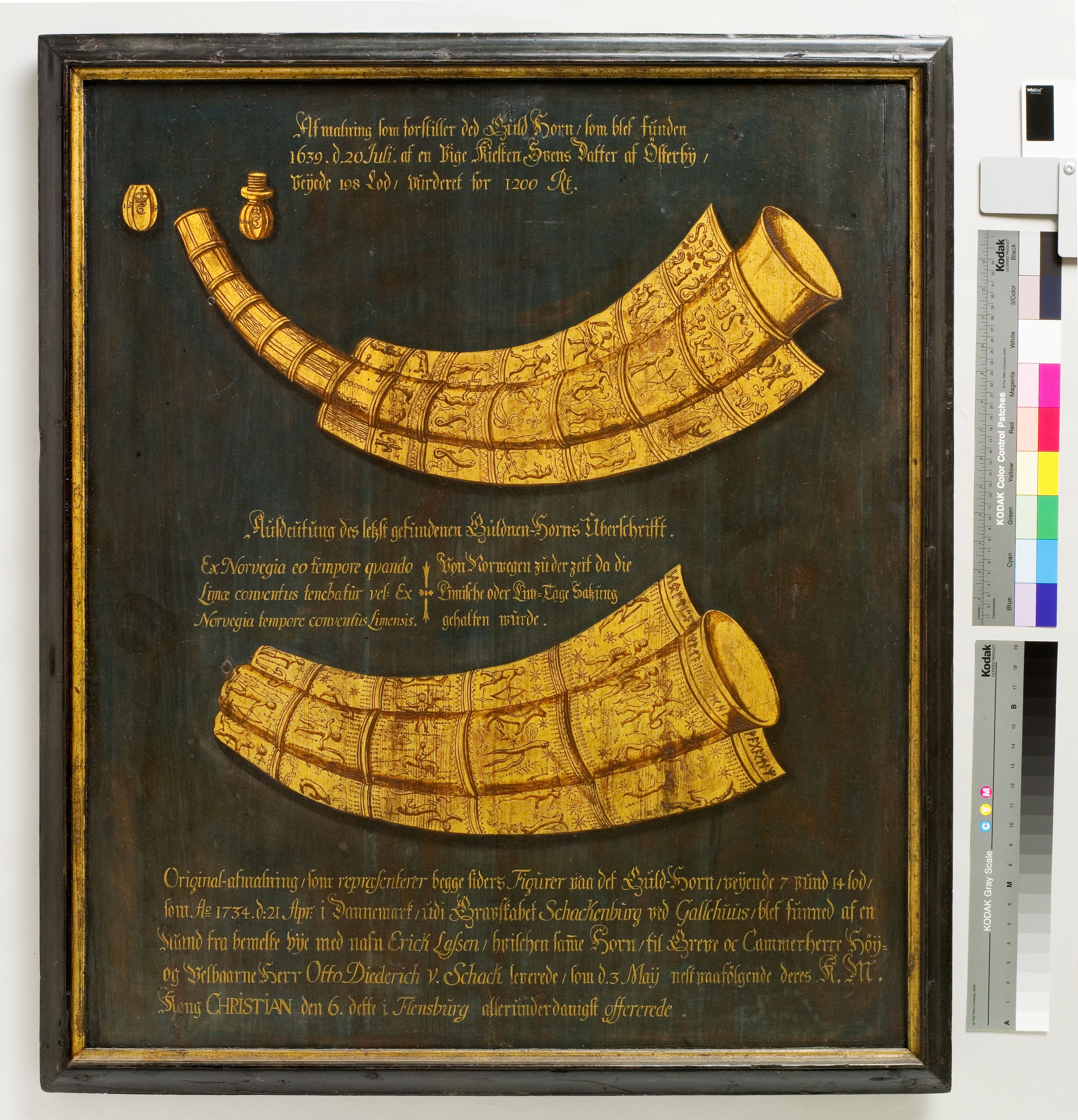 Maleri på træ af guldhornene. Jernalder, votiv/depot.