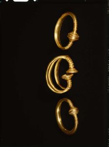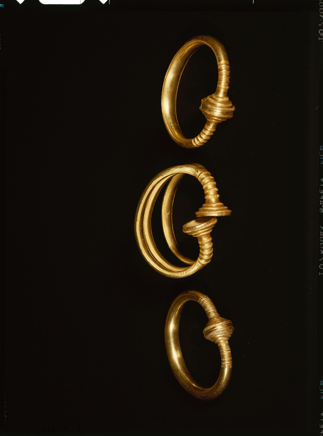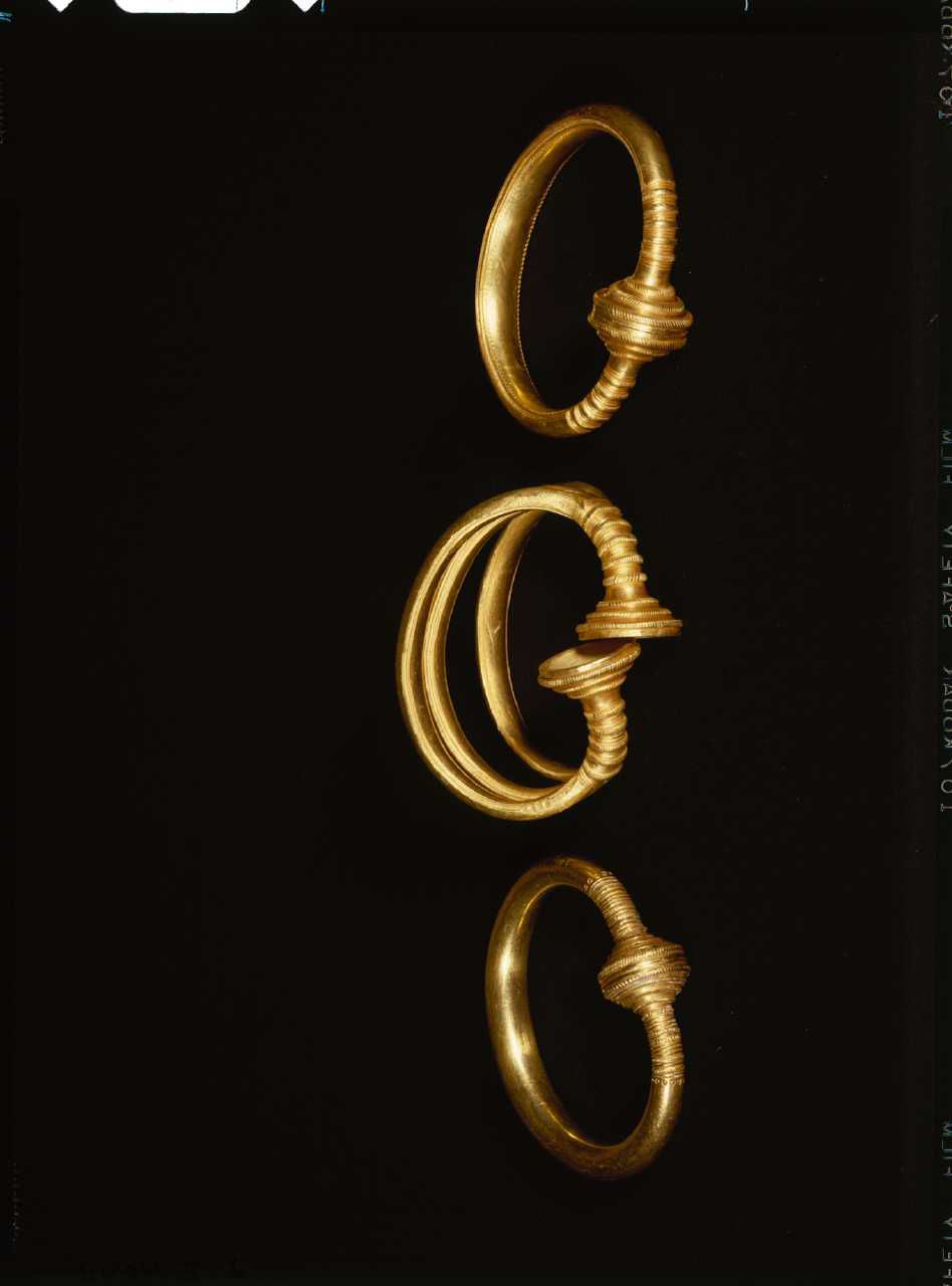 3 edsringe fra Neble, Boelslunde. Til venstre (nederst) løsfund (DNF8/81). I midten tvedelt edsring (DNF6/81) og til højre (nederst) edsring (DNF7/81) begge depotfund fra Gammelgaard, Neble.