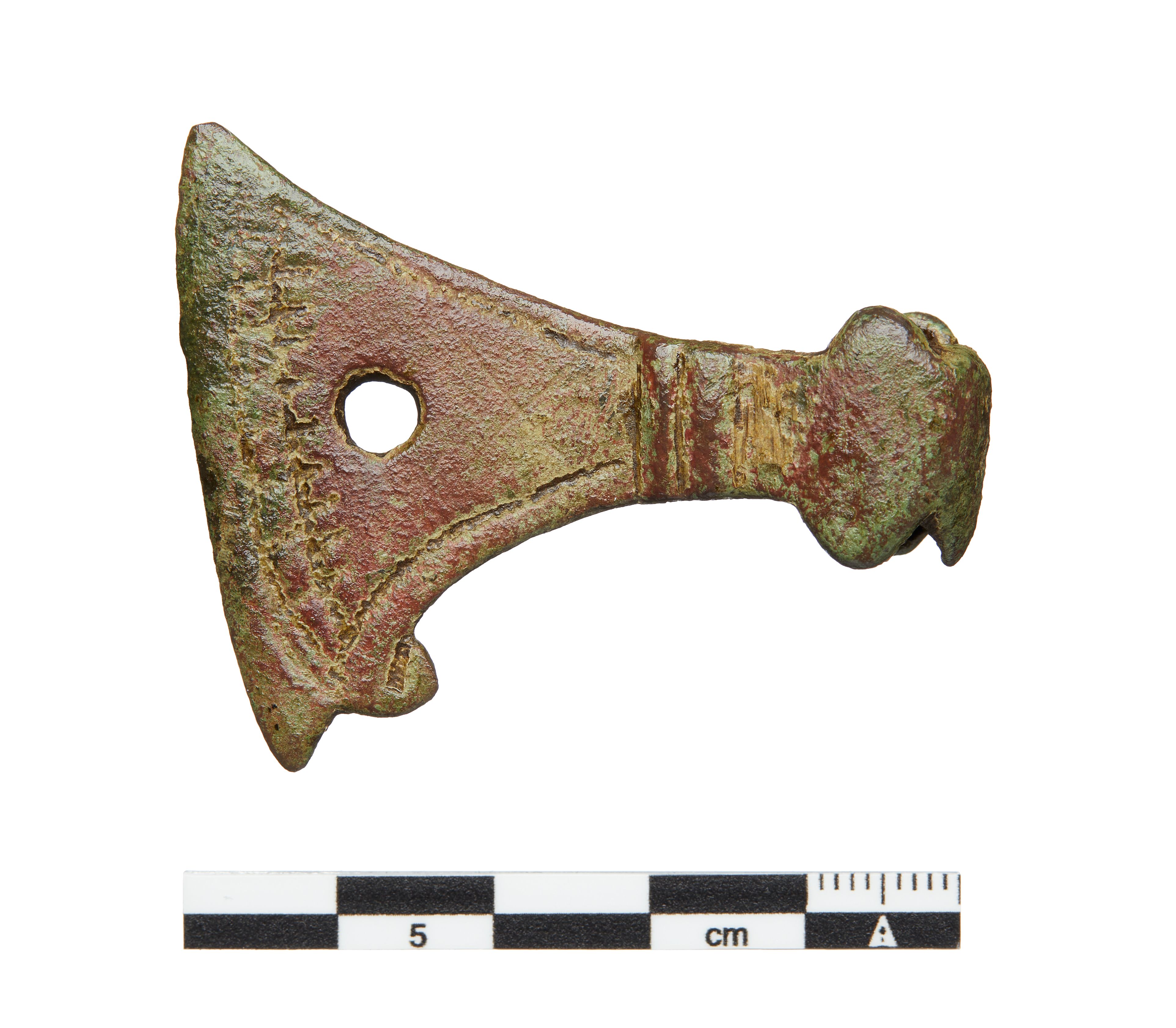 "Miniature-økse (Olavs-økse). Øksen har bred æg. På den ene side af bladet ses stempellignende ornamenter langs øksens æg og sider. På den anden side af bladet kan der være fletbånd, men trænger til afrensning for at dette kan afgøres. En gennemboring midt i øksebladet. Rektangulært skafthul og halvcirkulære flige på over- og underkant ved skafthullet. Et lignende stykke fra Bornholm C 33319, men der er ornamenteret med cirkulære stempler.",