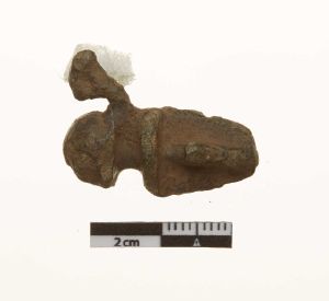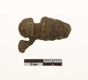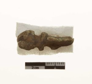"Del af hovedplade med en kraftig profileret knop. På siden af knoppen en tap fra støbningen. På de bevarede dele af hovepladen tværgående furer. På bagsiden ansats til nålefæstet.",