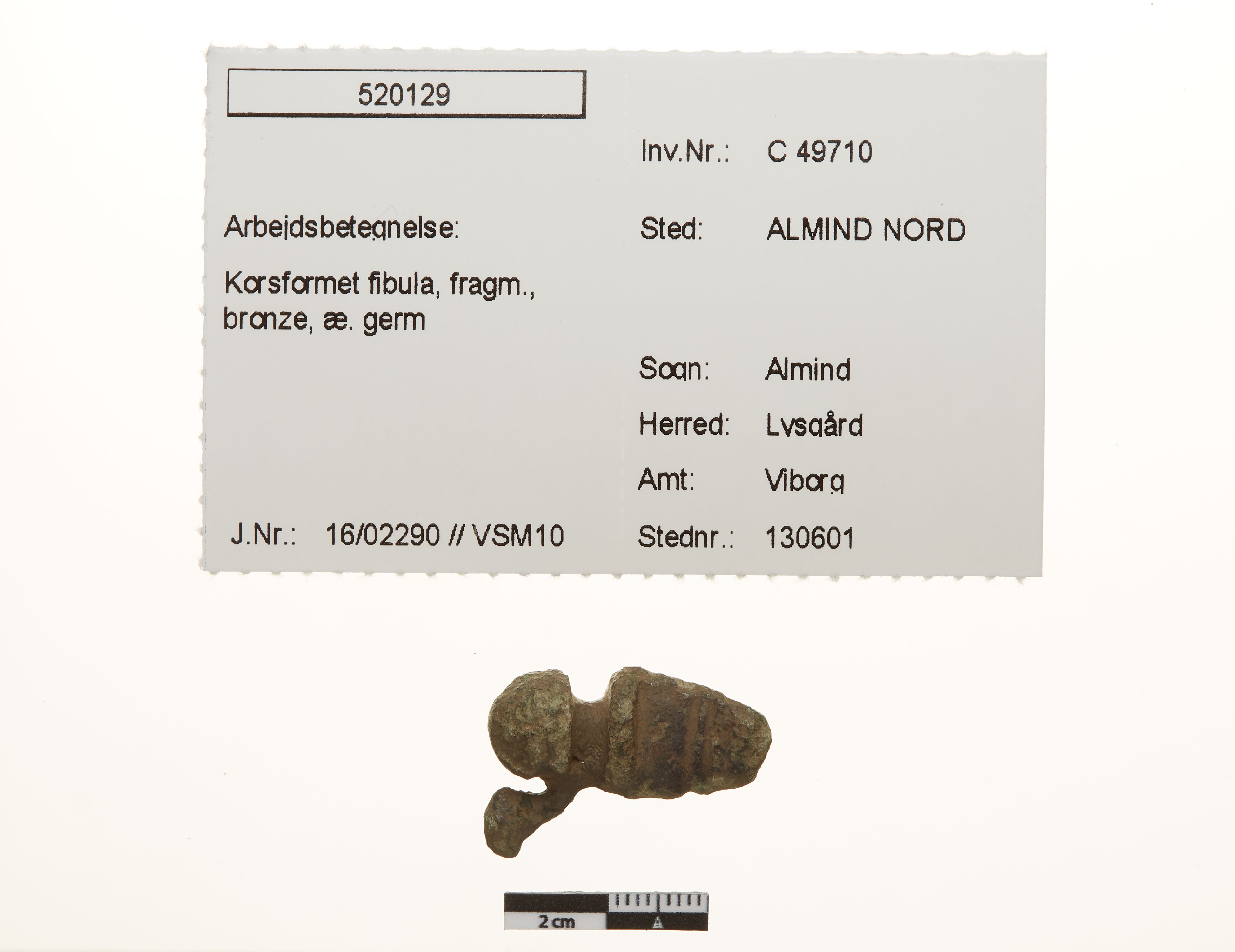 "betegnelse": "Korsformet fibula, fragm., bronze, æ. germ",