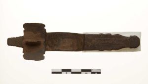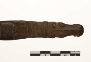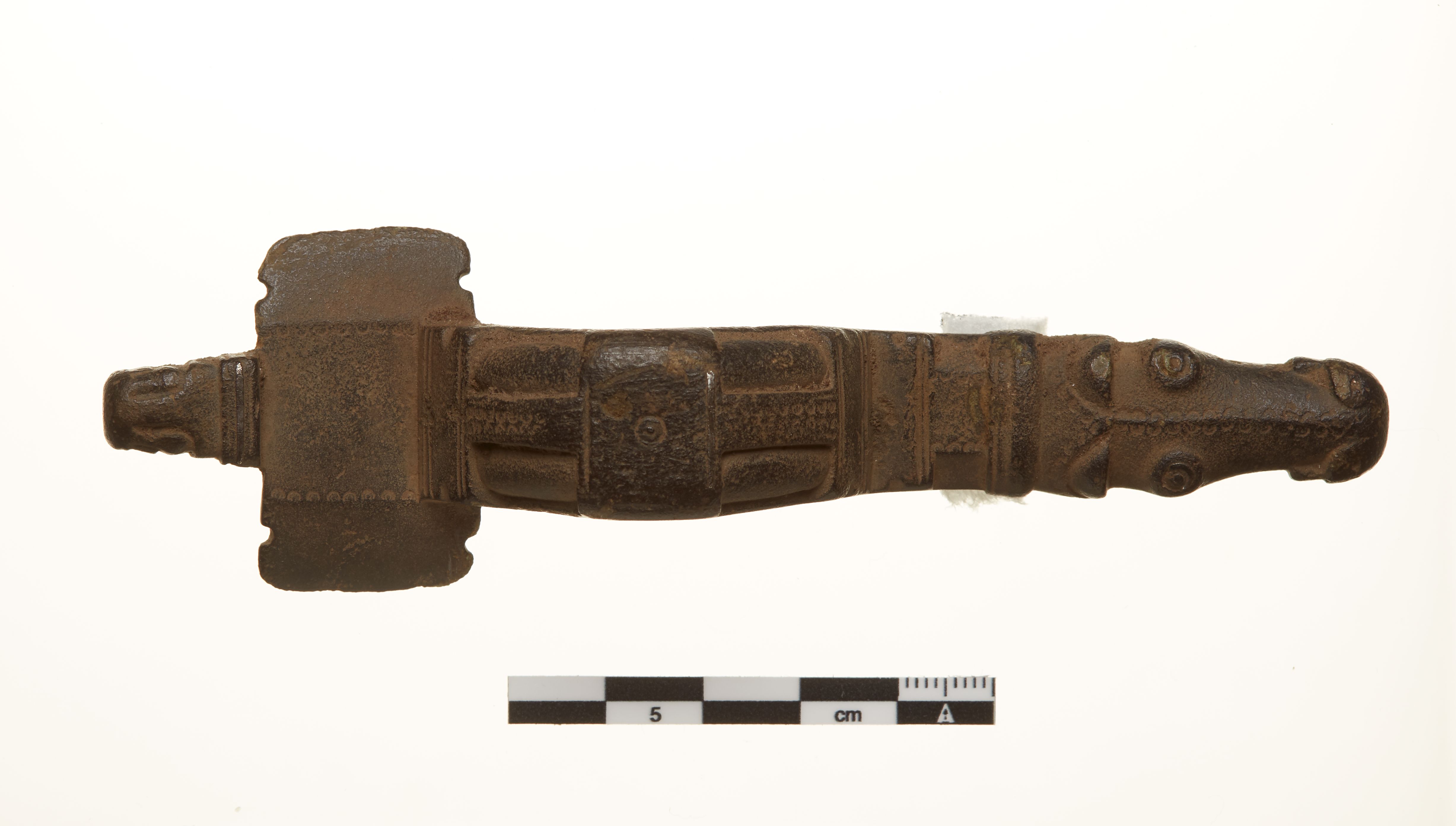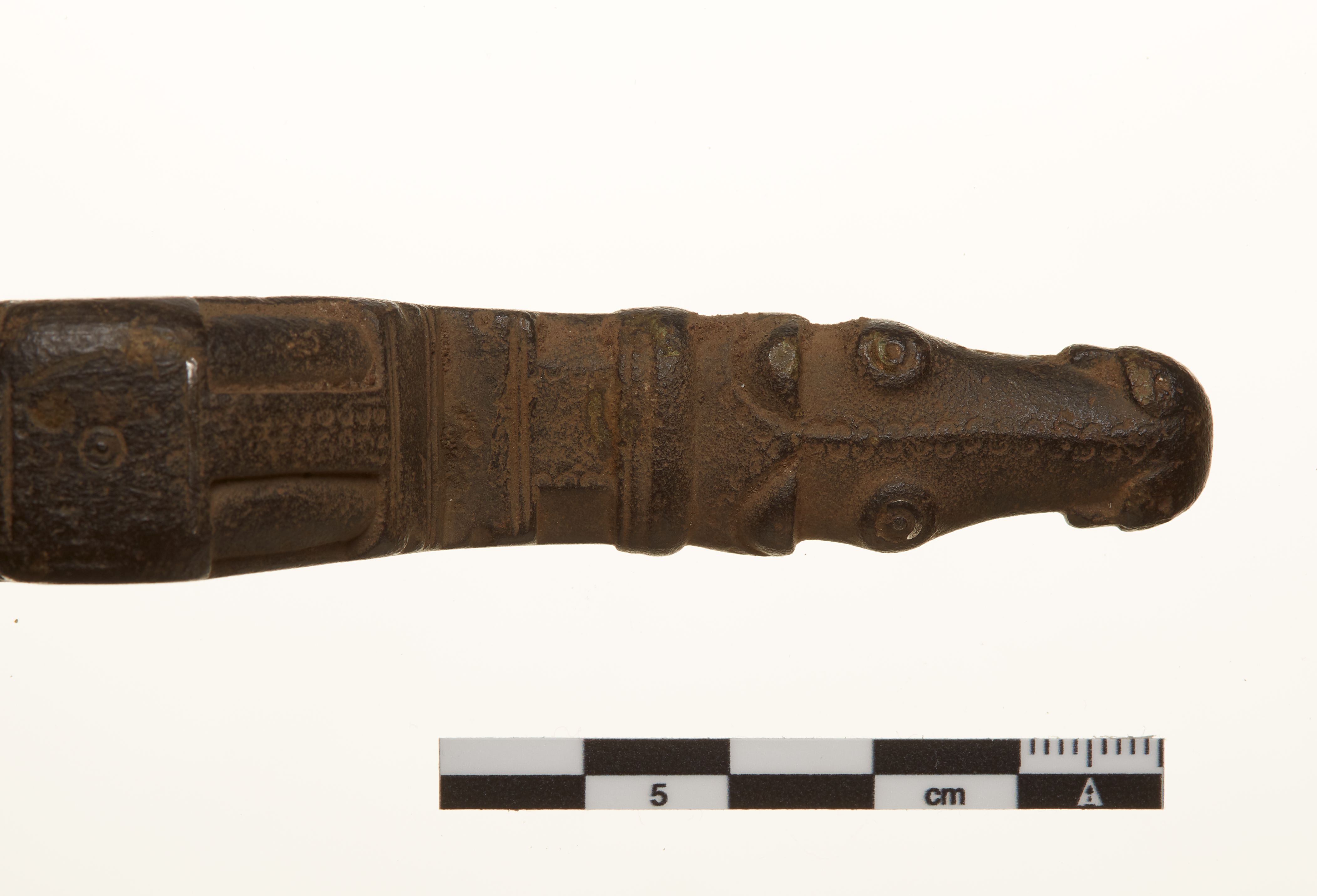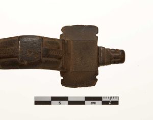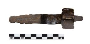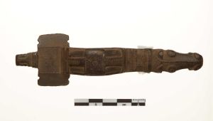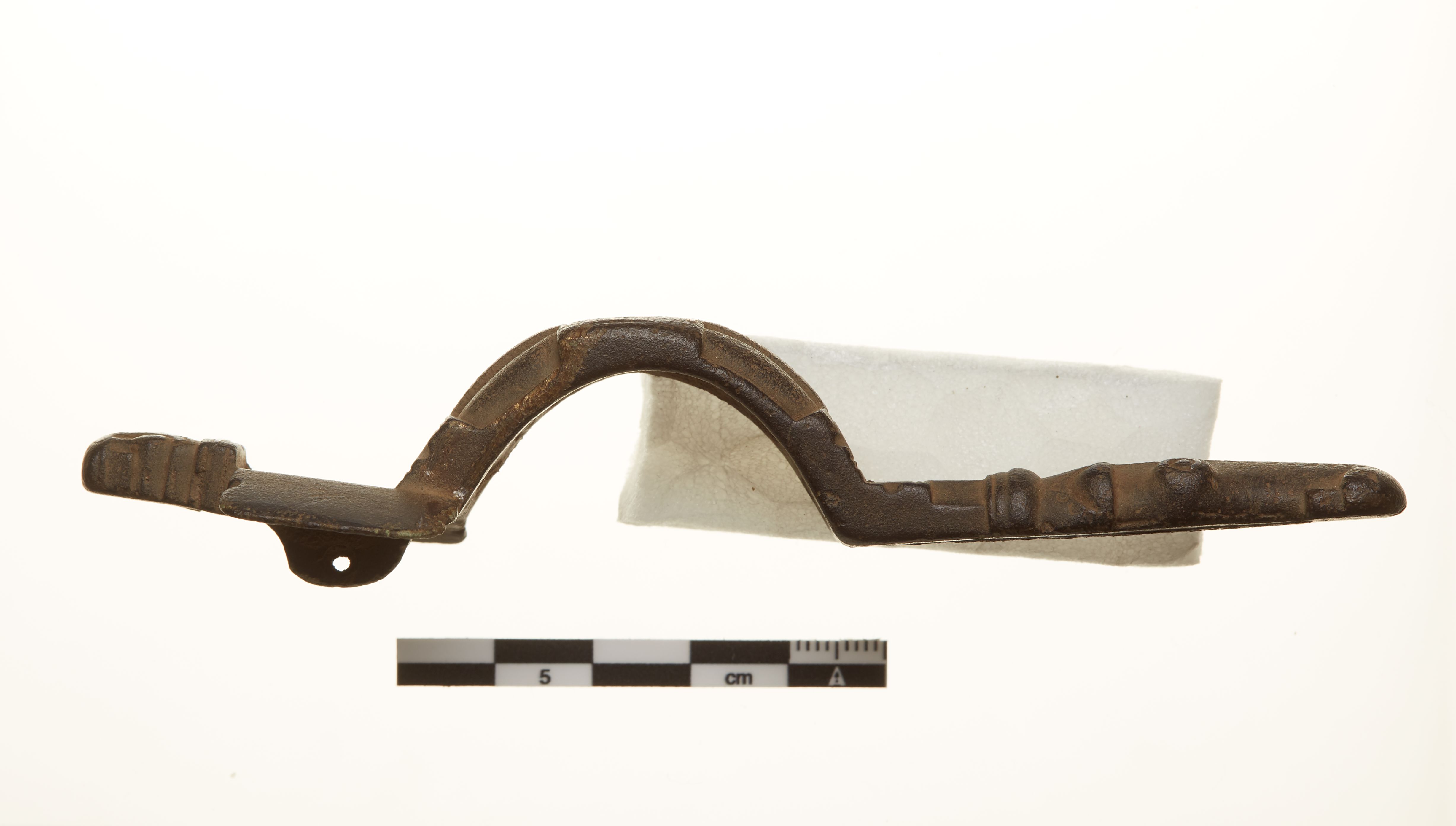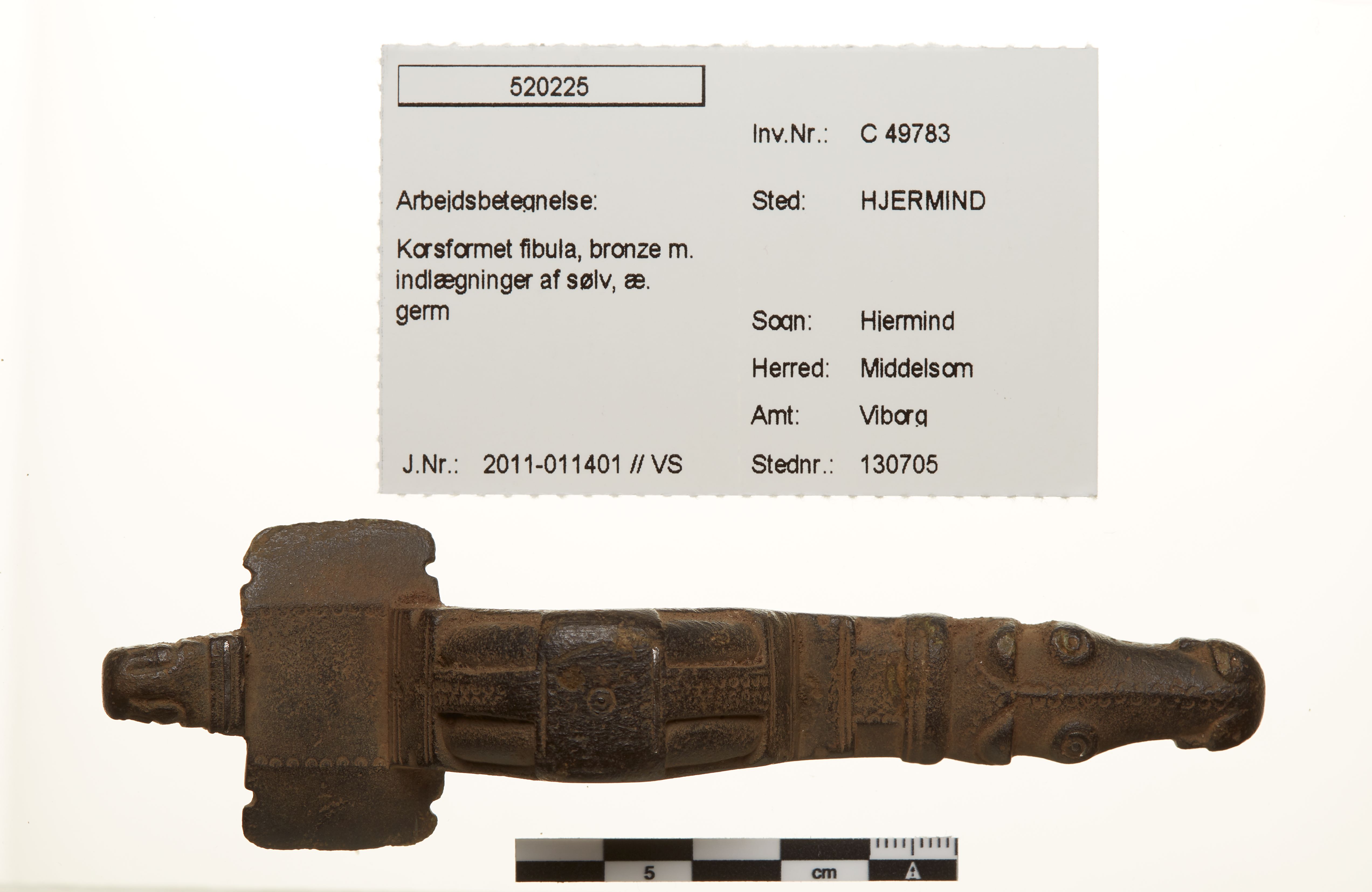 "Velbevaret og unik korsformet fibula af bronze med indlægninger af sølv. Hovedpladen har et rektangulært midtfelt, der langs kanten mod de let skrånende sideplader har en række af halvmåneformede stempler.I de to skrå dele af hovedpladen ses fire halvcirkler - nittehuller eller lignende? Øverst på hovedpladen er påsat et dyrehoved, hvor der først er en ramme med en indlægning af sølv. Herefter selve dyrehovedet med plan underside. Dyret har runde øjne og minder i høj grad om dyrehovedet C 49633 fra samme lokalitet, mindre forskel i dimensionerne. På bøjlen ses op mod hovedpladen et rektangulært felt afgrænset af smalle furer. Midt i feltet kantkant. Herefter en rund bøjle med en bred ophøjet liste, der er ornamenteret med stempler, denne ornamentik gentages på den anden del af bøjlen efter det flade rektangulære midtfelt. Dette er afgrænset af en smal fure med ind lægning af sølv. Midt på feltet et cirkelornament. Nederst på bøjlen og øverst på foden rektangulære felter som ved overgang til hovedplade med kanthak. Herefter en vulst inden det store dyrehoved på foden. Dyrehovedet har markerede øjenbruensbuer, næseryg og snude. Runde ophøjede øjne med indlægninger formentlig af sølv. På bagsiden nålefæste, men ingen spor efter nåleholder.",