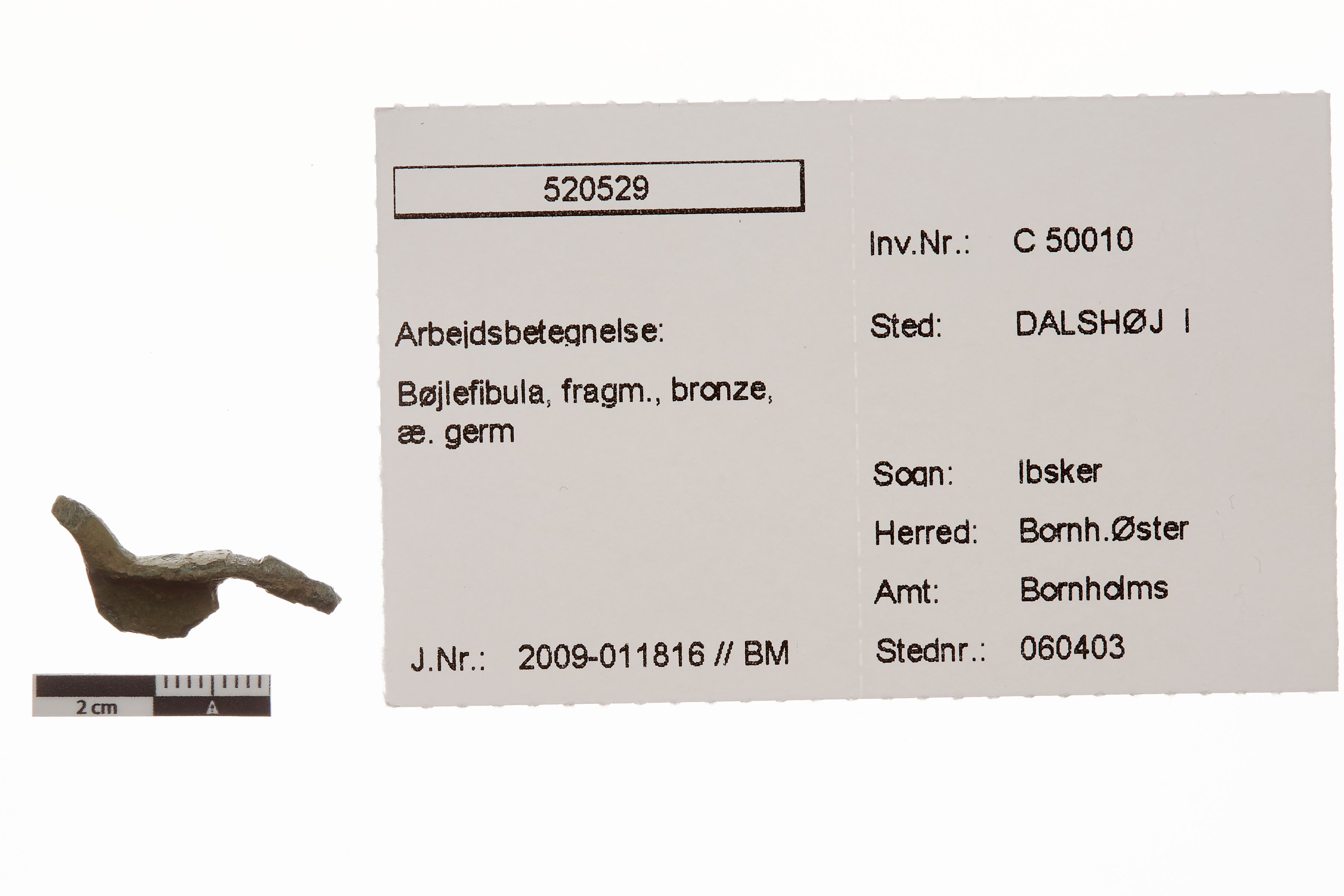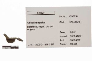 "betegnelse": "Bøjlefibula, fragm., bronze, æ. germ",