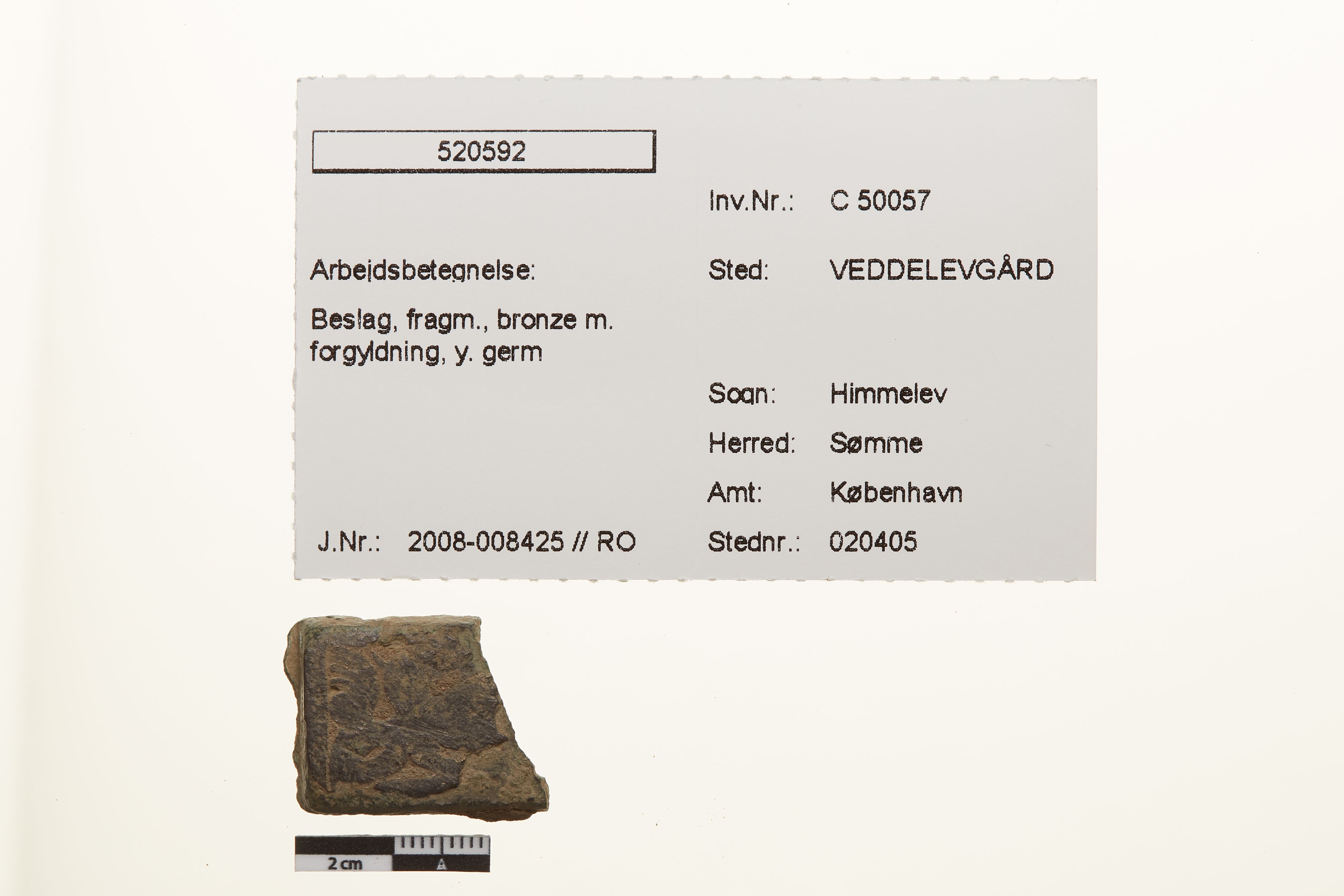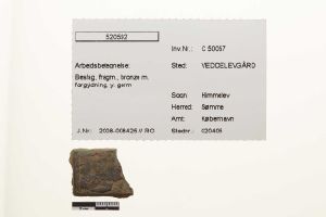 "betegnelse": "Beslag, fragm., bronze m. forgyldning, y. germ",