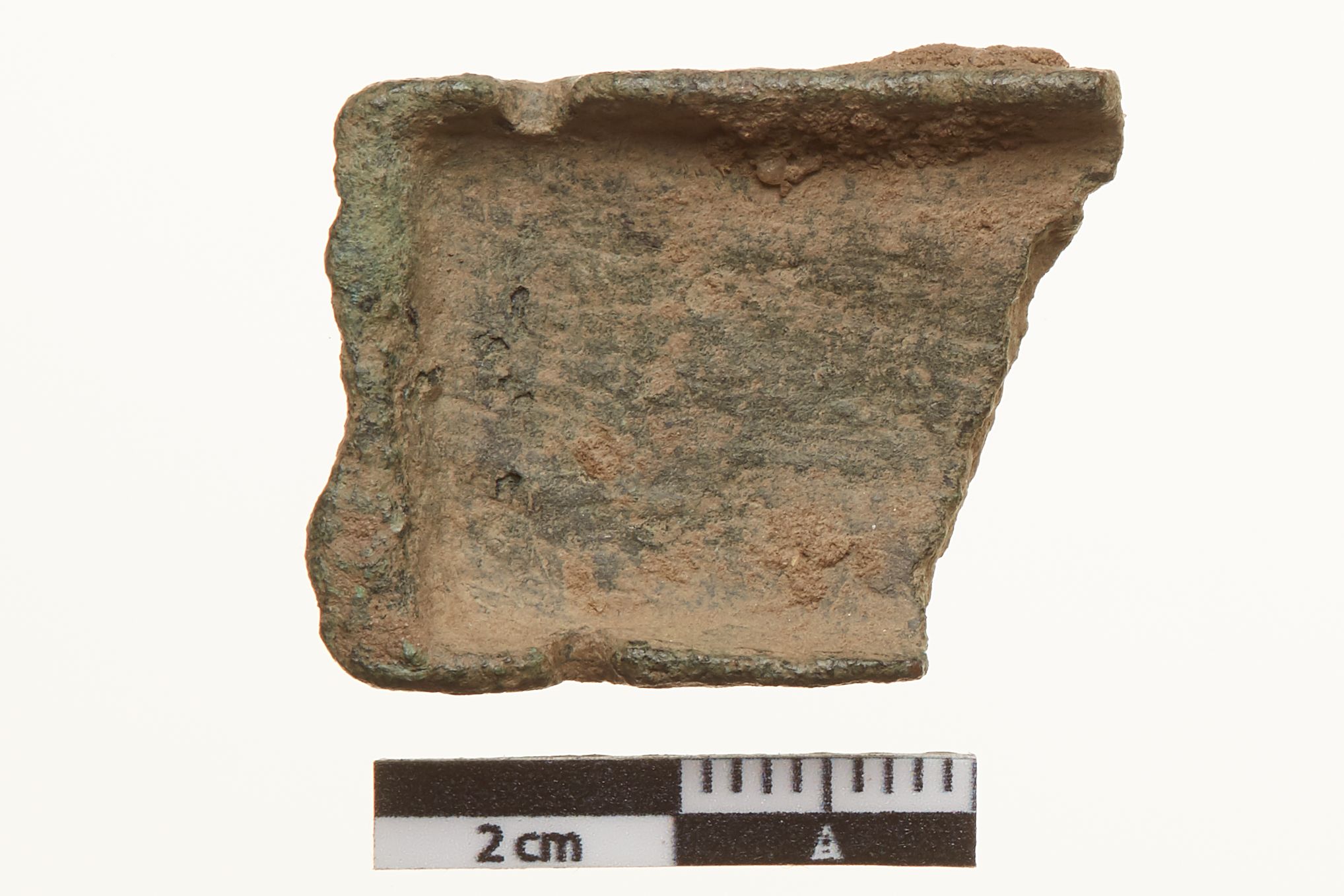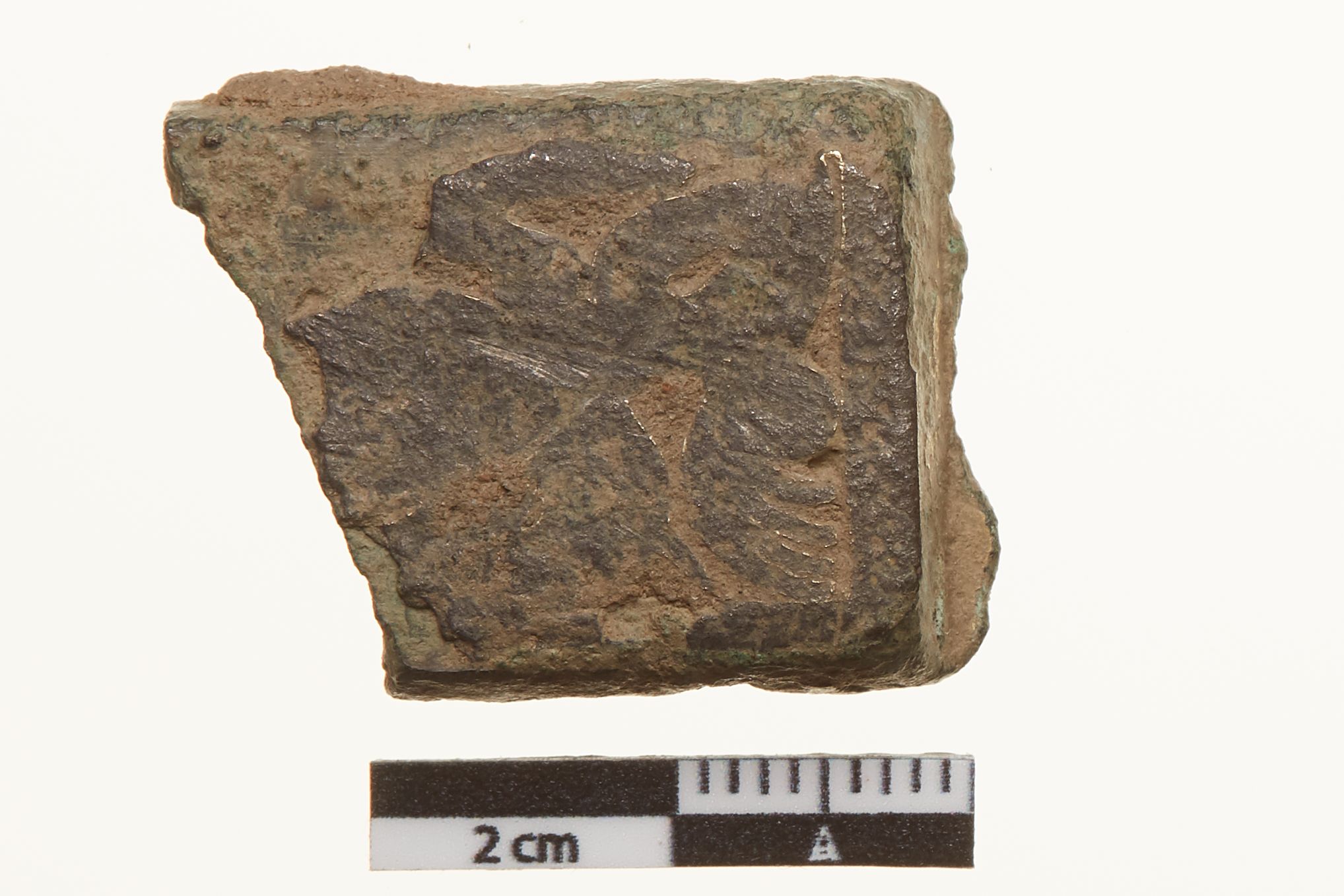 "Fragment af rektangulært beslag sammenhørende med C 50058. Der er rester af forgyldning på stykket. I det rektangulære billedfelt ses to dyr. Ornamentet er fladedækkende.",