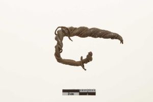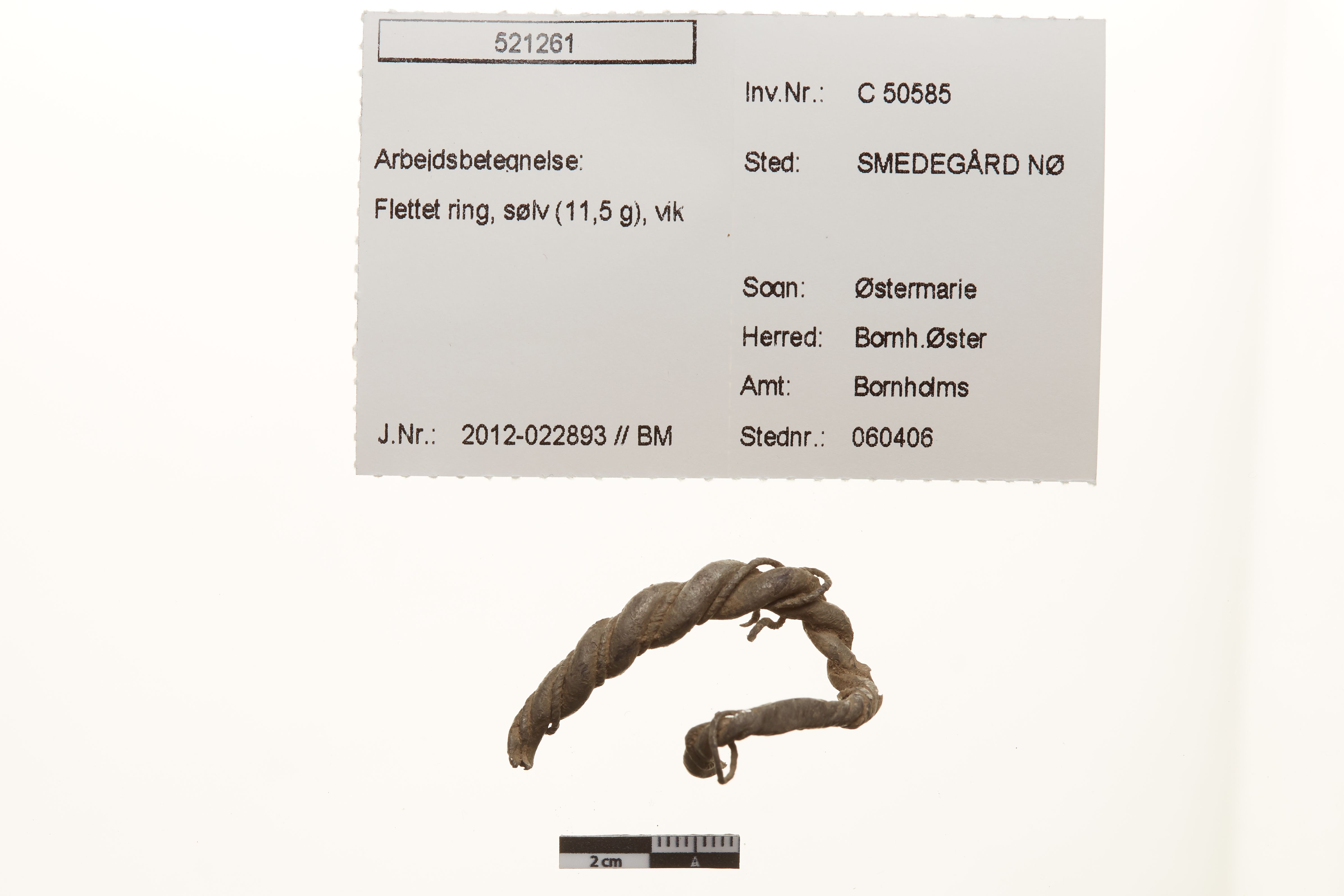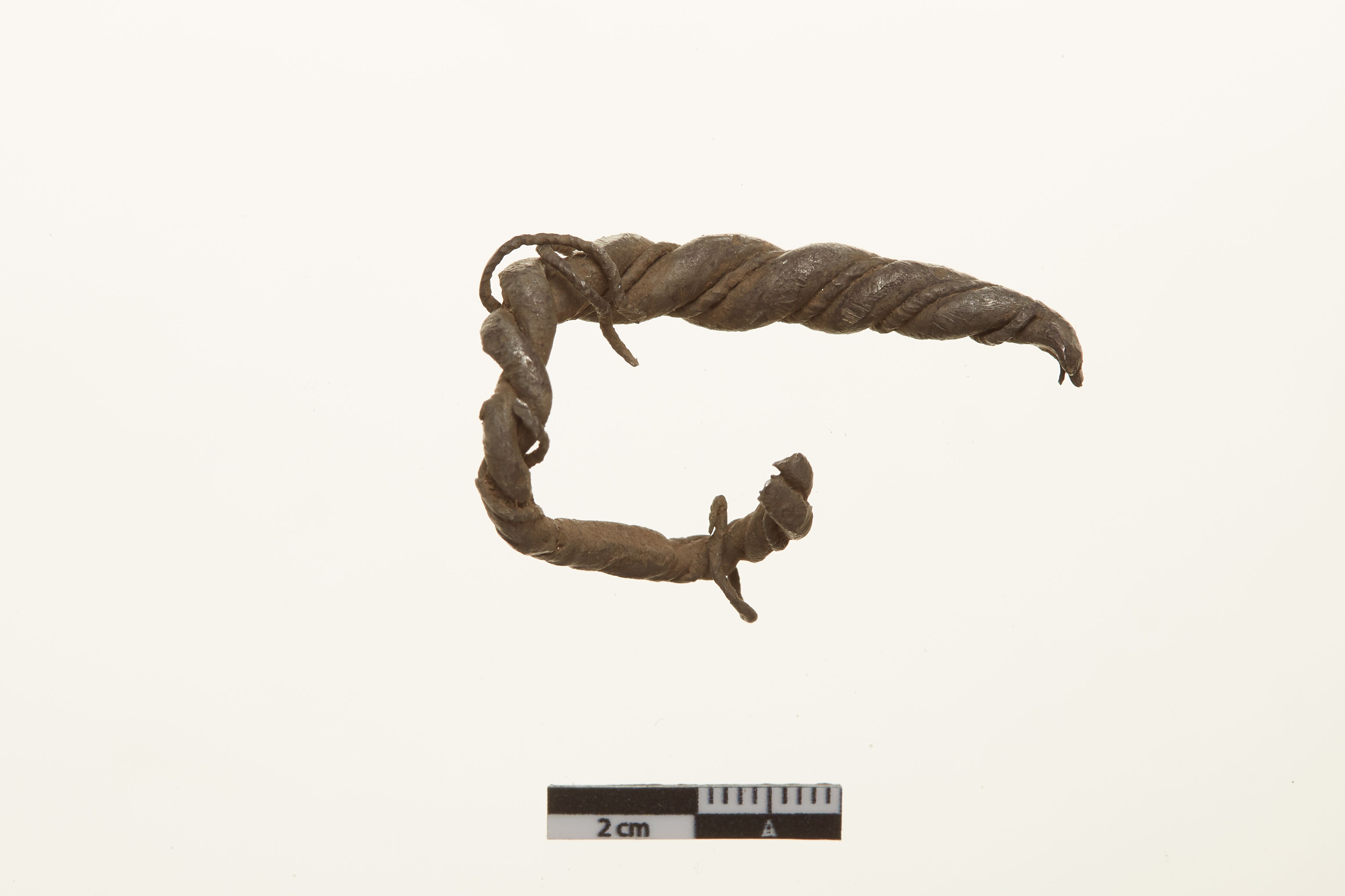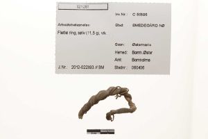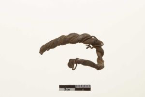 "Del af hals- eller armring. Dannet af to sammenfeltede stænger, der er og omviklet med en tynd tråd. Stykket er forbukket.",