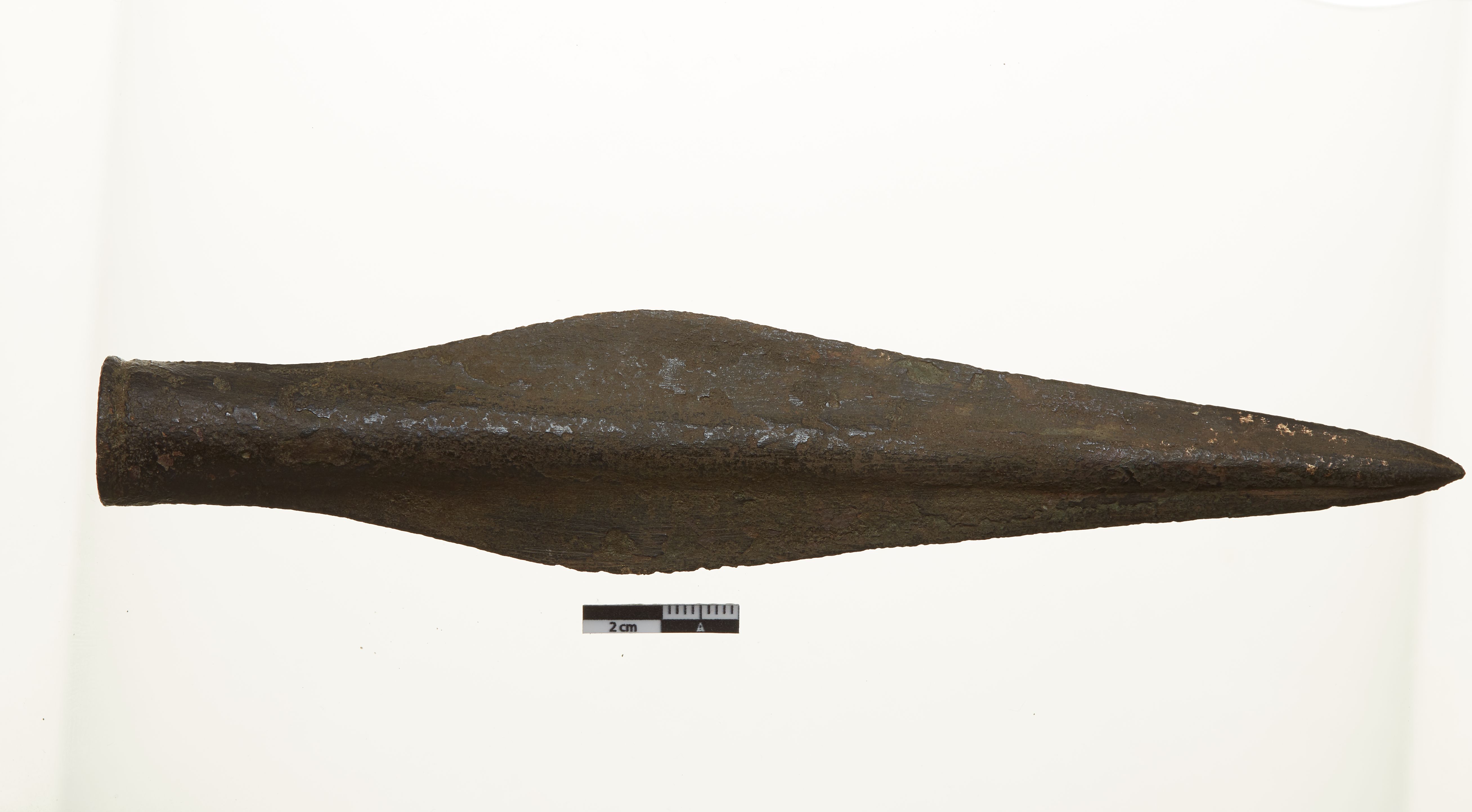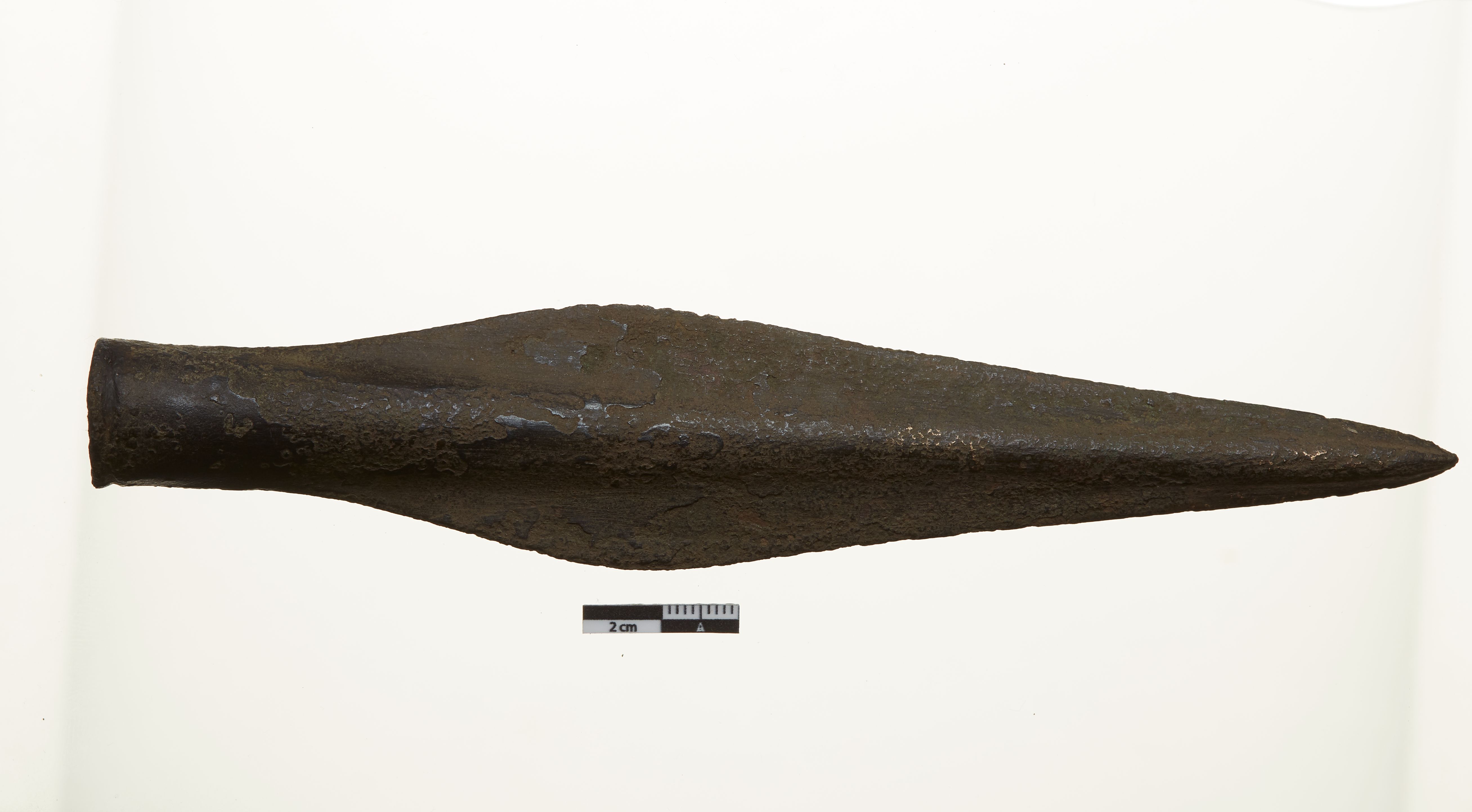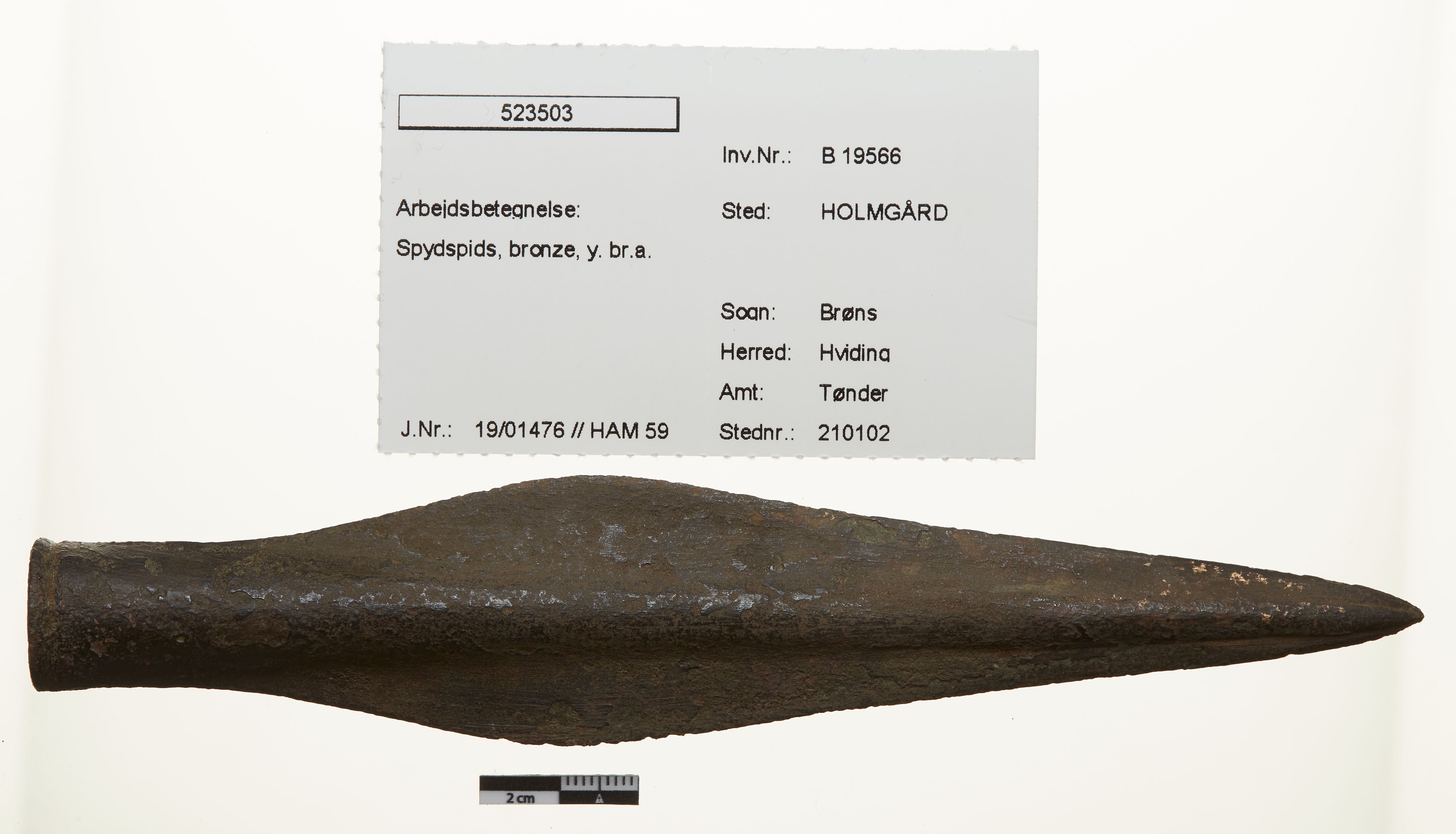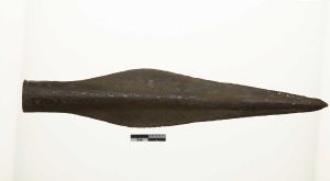 "Spydspids med kort dølle. Æggene går tæt ned mod dølleranden, og den hule dølle fortsætter gennem bladets midte ud til spidsen.. Bladet er bredest på midten med et \"knækket\" langstrakt rhombisk forløb.\r\nStykket har ingen ornamentik, bortset fra en smal fure, der omkranser dølleranden.",