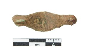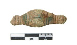"Ligearmet fibula med afrundede endeplader, der er ornamenteret med tværgående furer. På bøjlen ses også tværgående furer, disse afgrænser midtfeltet, hvor der er en langsgående fure. Rester af nåleholder og -fæste med korroderet jern.",