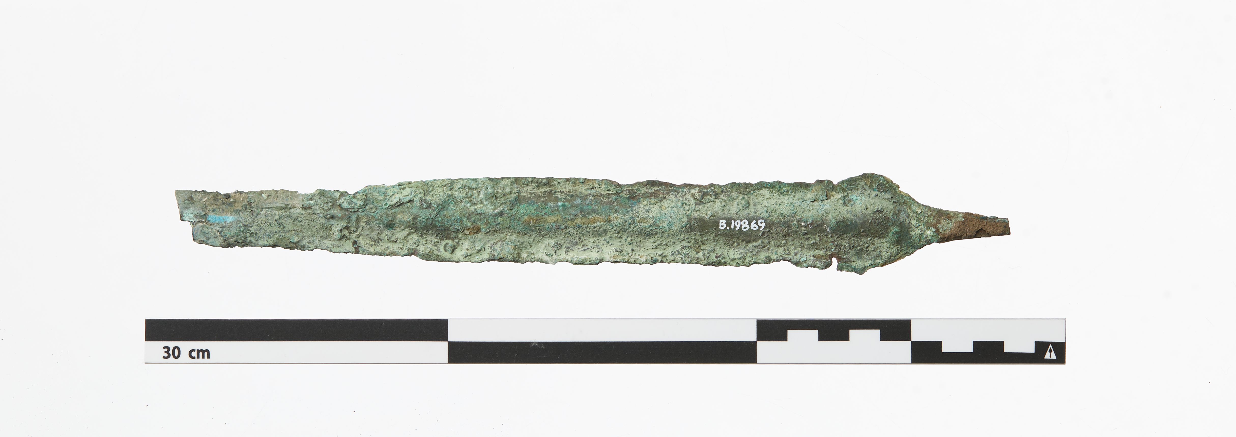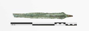 "Fragment af klinge og greb med grebspids. Skrå skuldre. Klingen har en kraftig midtribbe. Nederste del af klingen mangler, Temmelig nedbrudt overflade."