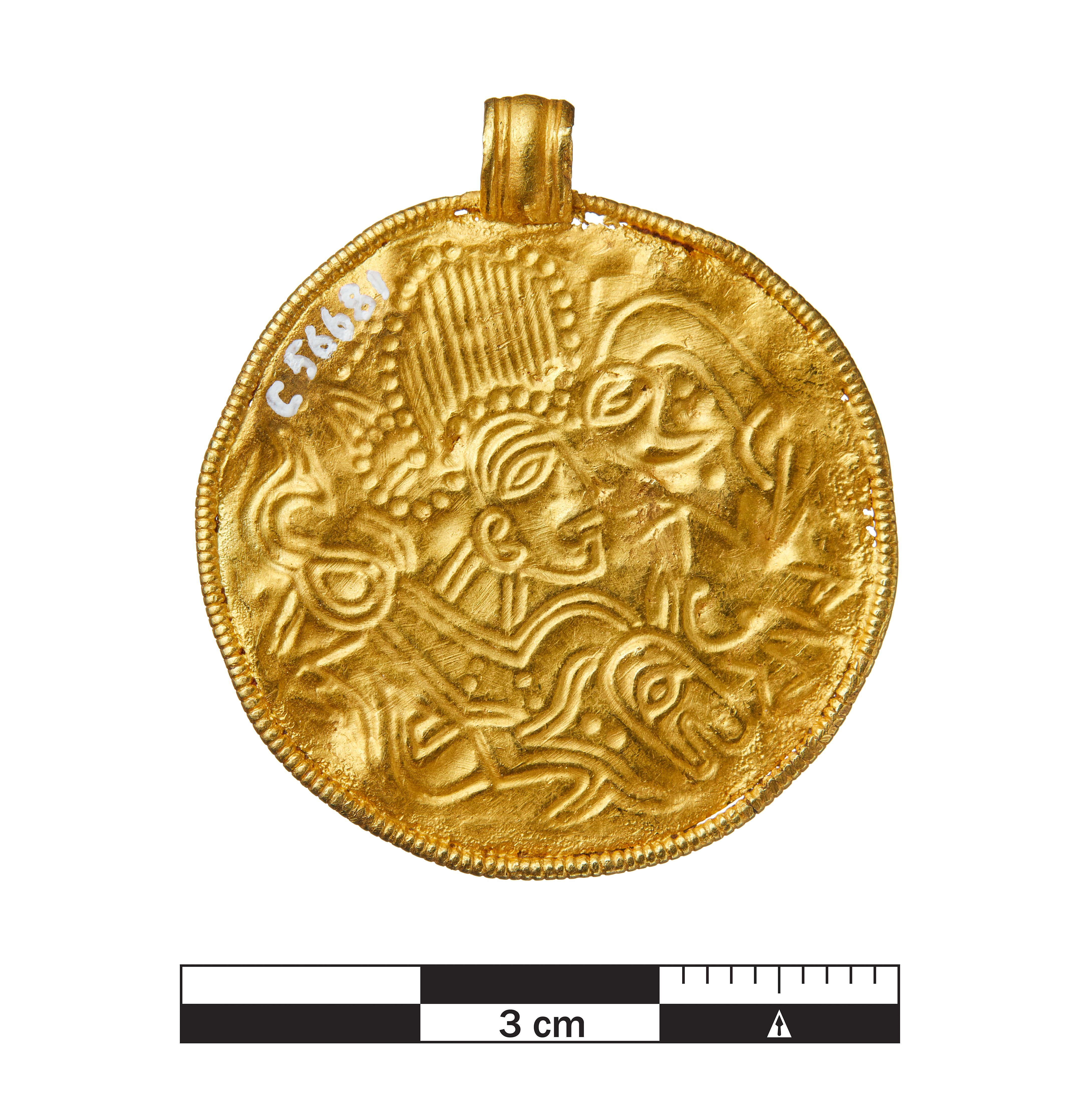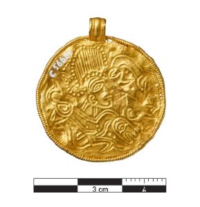 "Klassisk C-motiv med et mandshoved - her med overkrop - over et hestelignende dyr - her dog med horn og fligede fødder - samt en fugl, som ser manden dybt i øjnene. Hans frisure har efterklange af diademet på de romerske kejsermønter i form af perlekonturen og perlebåndet bag nakken, og der er også reminiscenser af det flettede hår man ser på beslægtede præg (bl.a. Fynsbrakteaten), som kan være et germansk herskersymbol. Motivet kan tolkes som Odin, der helbreder Balders sårede hest, som symbol på hans magiske magt over døden.\r\nMidt imellem hovederne på fuglen og rytteren står en enkeltstående t-rune. Over hestens mule er der fire runer, som lyder auls. Det giver ikke rigtigt nogen mening, men vi kender det fra andre fund – heriblandt også brakteater – at man kan bytte lidt rundt på rækkefølgen af runer, så de magiske ord bliver sagt på mange forskellige måder. Runerne auls minder mest om trylleordene salu salu, som står på brakteaten fra Lellinge Kohave på Sydsjælland. Tolkningen af runerne er foretaget af Lisbeth Imer.\r\n\r\nBrakteaten var med astronaut Andreas Mogensen i rummet på Huginn-missionen 26. august 2023 - 12. marts 2024. Astronauten medbragte en række kulturhistoriske genstande fra flere museer, og undervejs fortalte han små historier om dem i film, der fra den internationale rumstation blev transmitteret ned til jorden. Som den eneste brakteat i verden har den været på rejse til stjernerne tur-retur. Den blev udvalgt, fordi motivets, hvor en af Odins ravne måske ses passer til missionens navn og formål: at flyve ud i verden hver dag for at samle ny viden.",