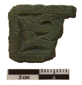 "Fragment af rektangulær pladefibula. På rammen to rækker af små runde stempler. I billedfeltet dele af et dyr i lavt relief. Båndformet krop og dele af et lår. Ben/fod ender i en fliget afslutning- hale? På dyret ses en dobbeltrække af små runde stempler. Nåleholder på stykkets bagside.",