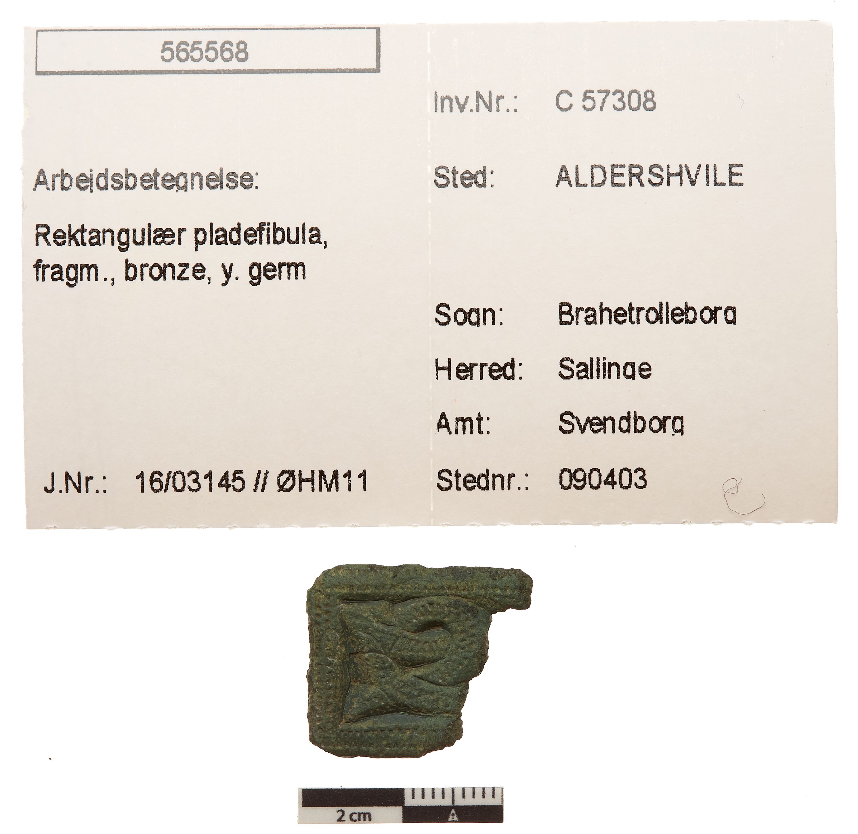 "betegnelse": "Rektangulær pladefibula, fragm., bronze, y. germ",