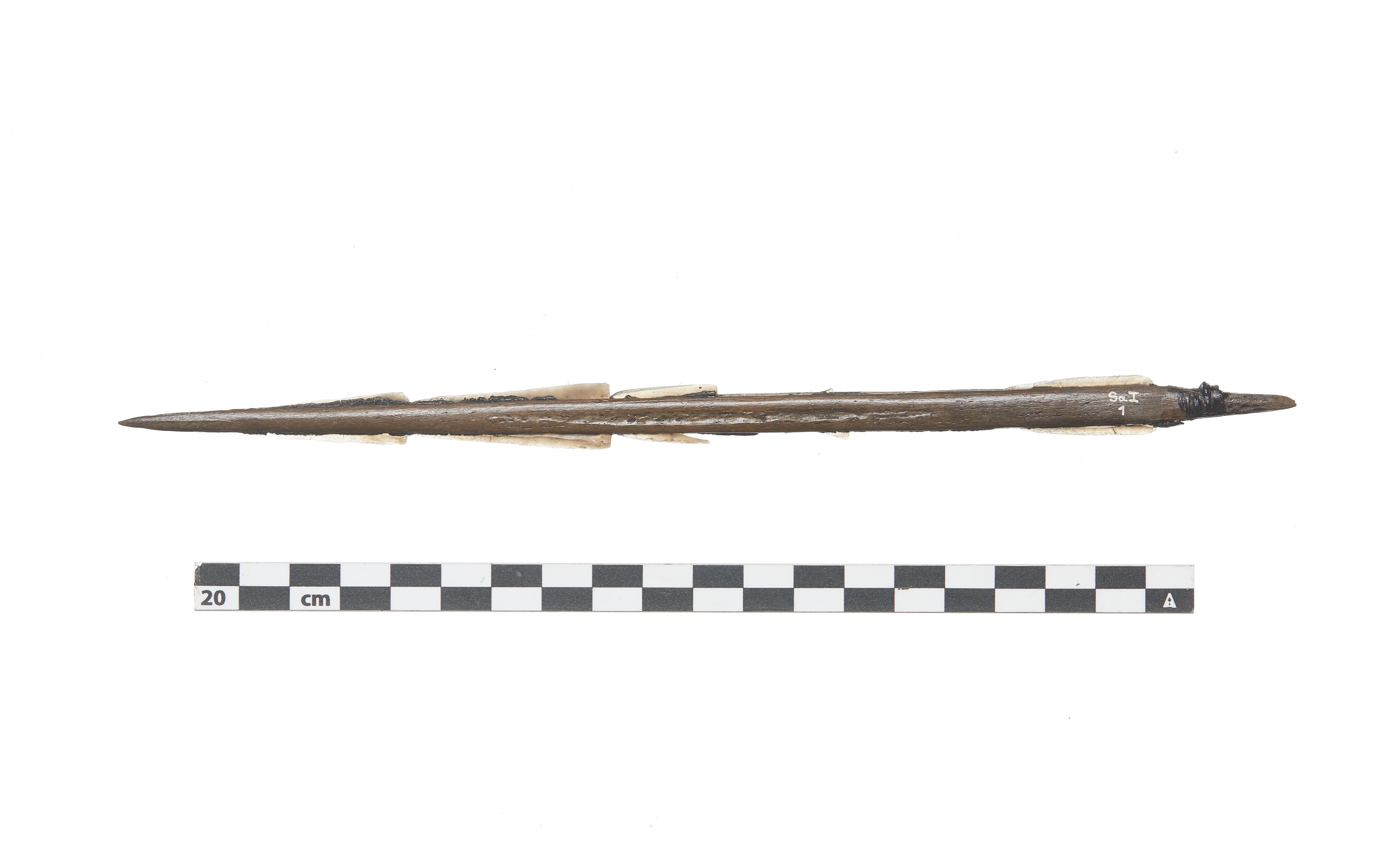 "Meget slot og velbevaret flintægspyd med ca. 8 bevarede mikrolitter. Der er ligekledes beg bevaret og bast fra surring."