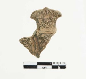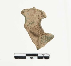 "Genstanden er et fragment af et korsformet beslag. Stykket er ornamenteret med slynget planteornamentik -tasilo?. Der er rester af forglydning på forsiden og nitter til montering på bagsiden. Der er tale om et importstykke af en kontinential oprindelse."
