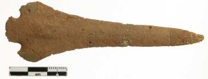 "Dolkklinge af bronze med let tagrygformet tværsnit. Gennemboringer til to nagler til fastgørelse af fæstet. Klingen er opskærpet."