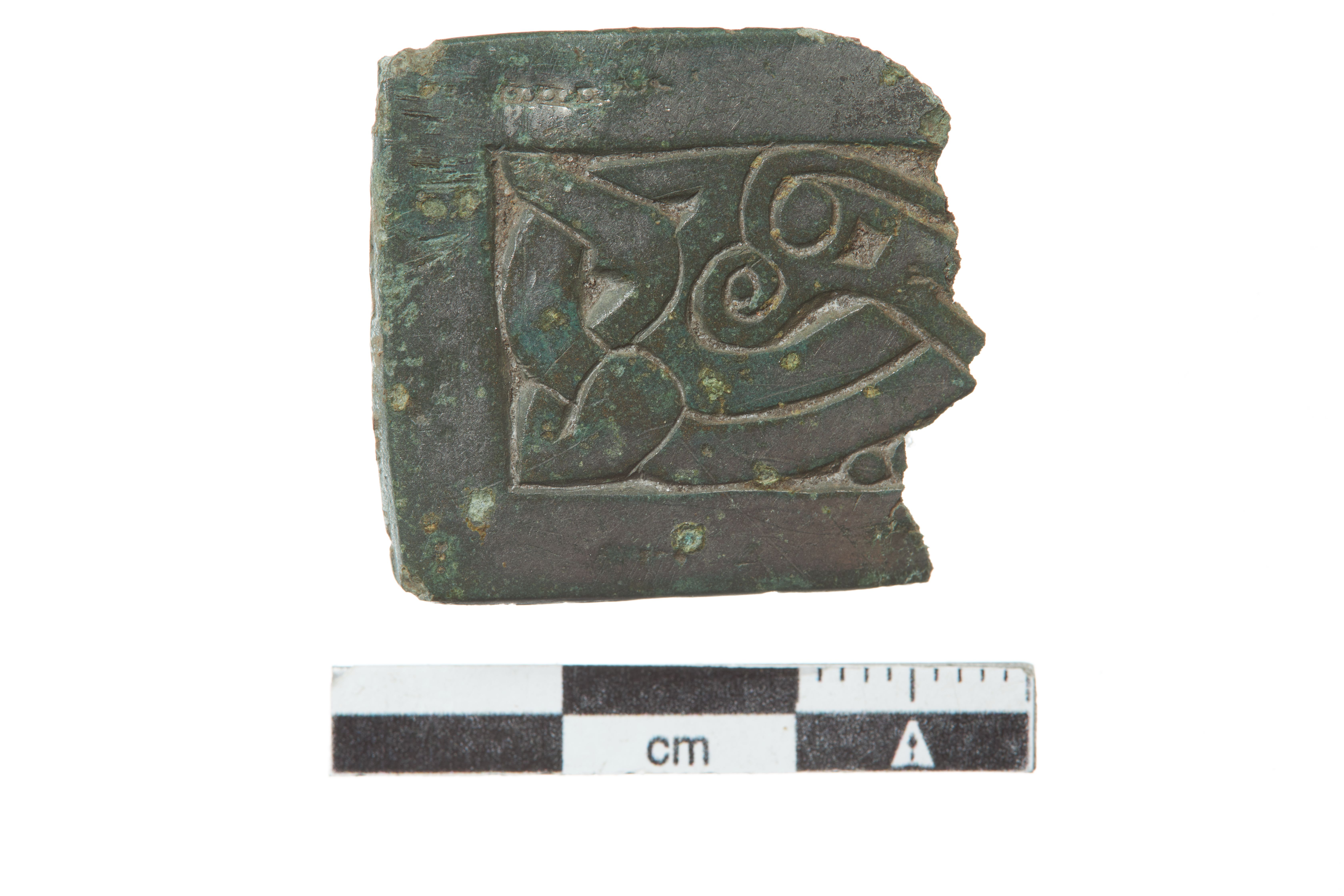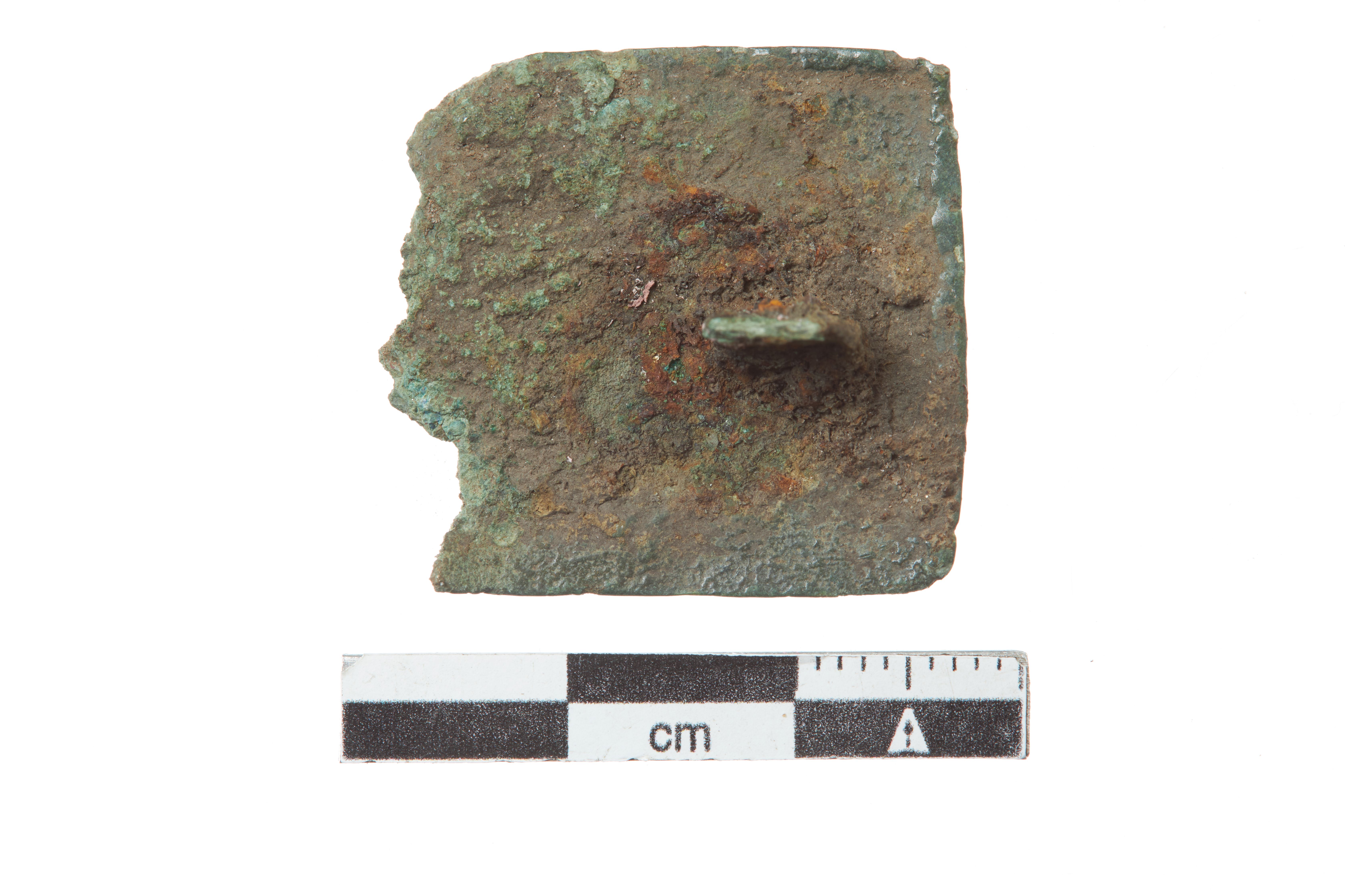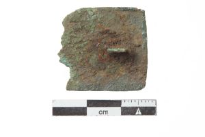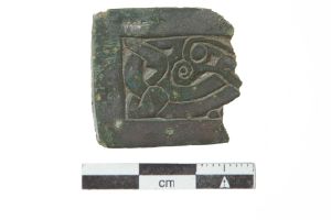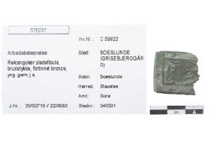 "Brudstykke af rektangulær pladefibula af fortinnet bronze. Forsiden viser en dyrefigur i stil C inden for en glat ramme. Bagsiden har rest af nåleanordning."