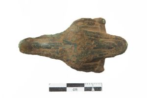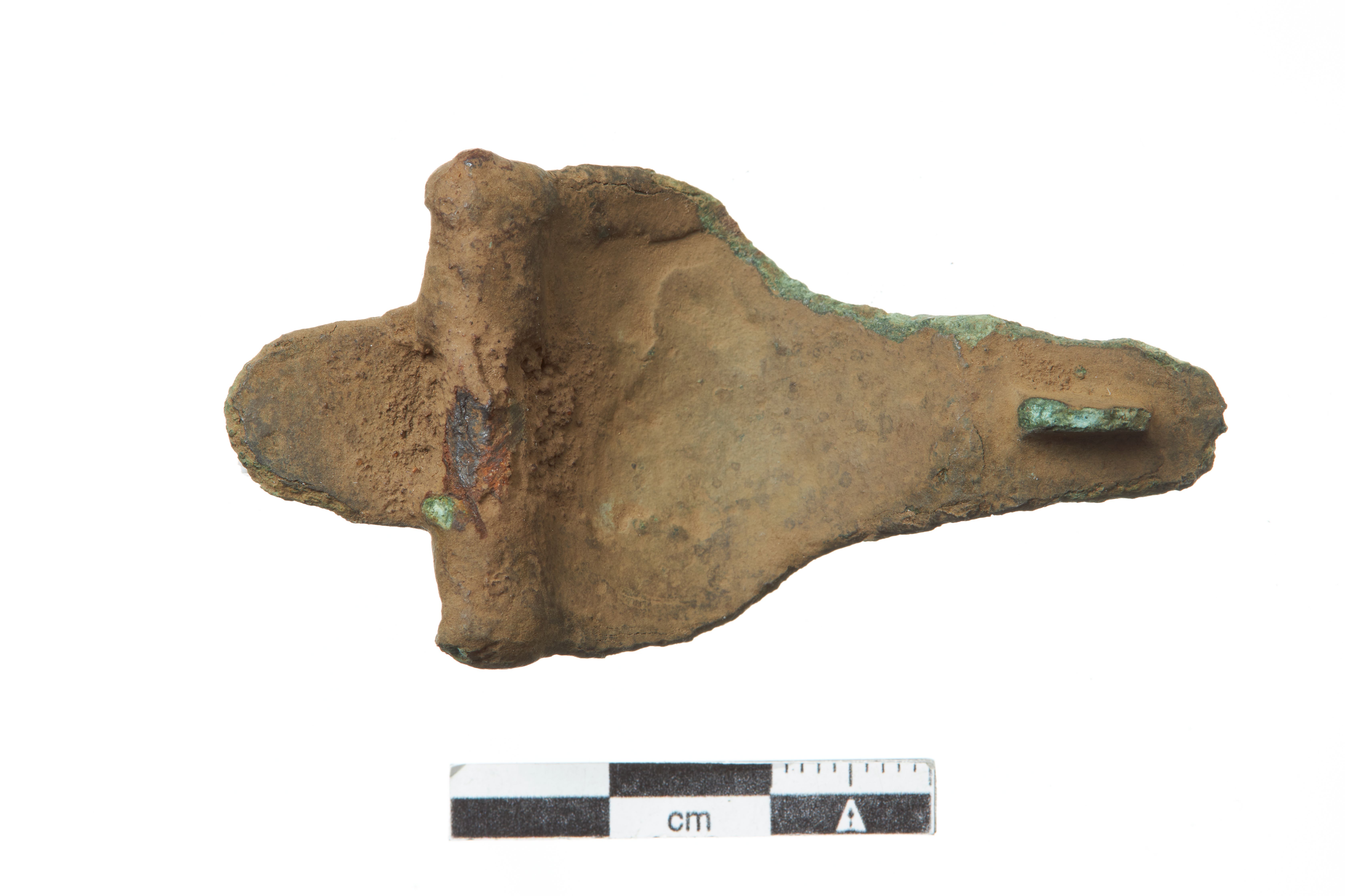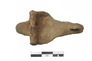 "Næbfibula af bronze med listeornamentik på oversiden. Nåleanordningen er bevaret.",