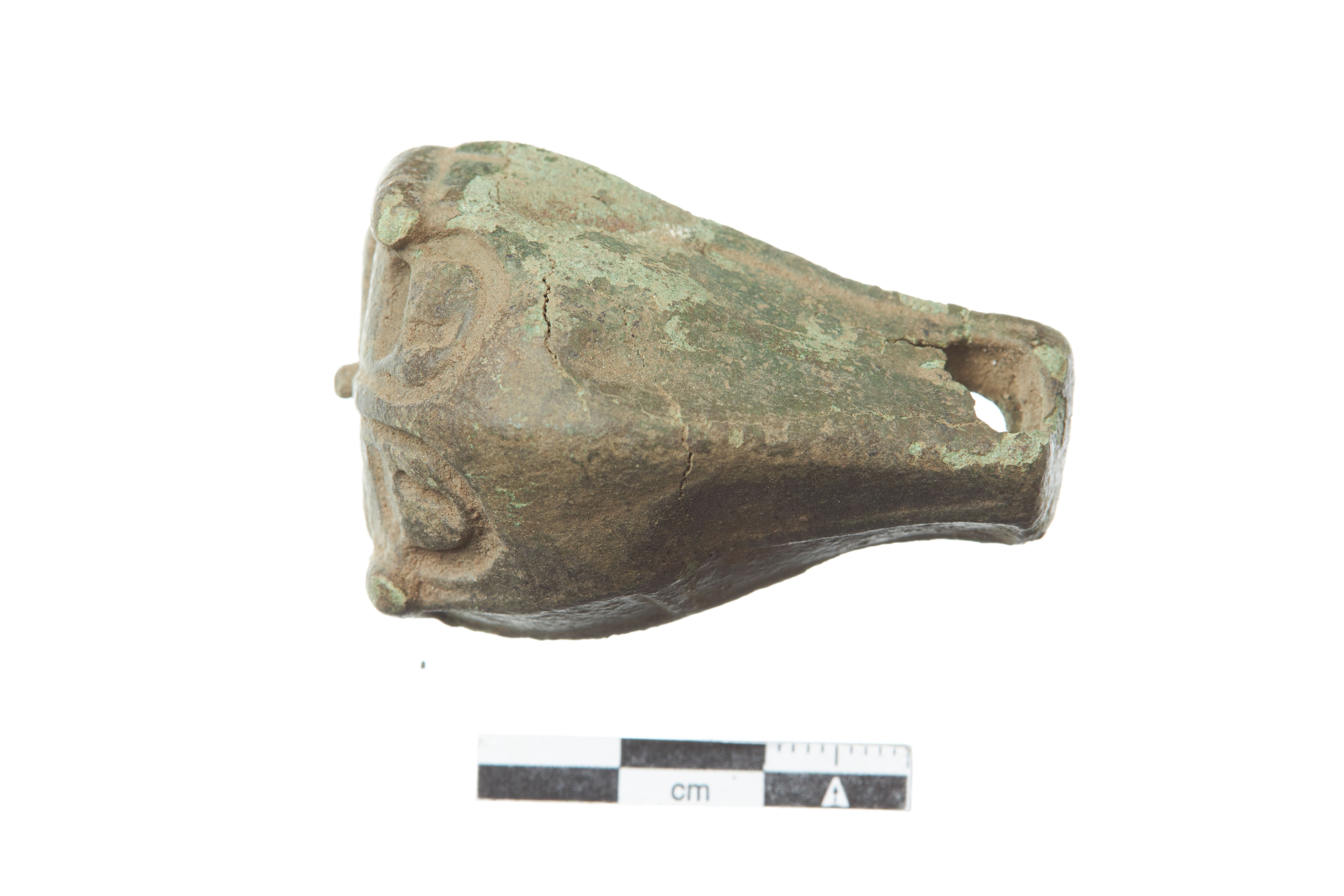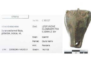 "Dyrehovedformet fibula af gotlandsk type med enkelte brud. Ornamenteret med lister. Bagsiden er hul med støbt nåleholder under snuden og rester af nålen ved nakken."