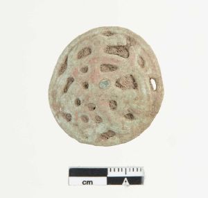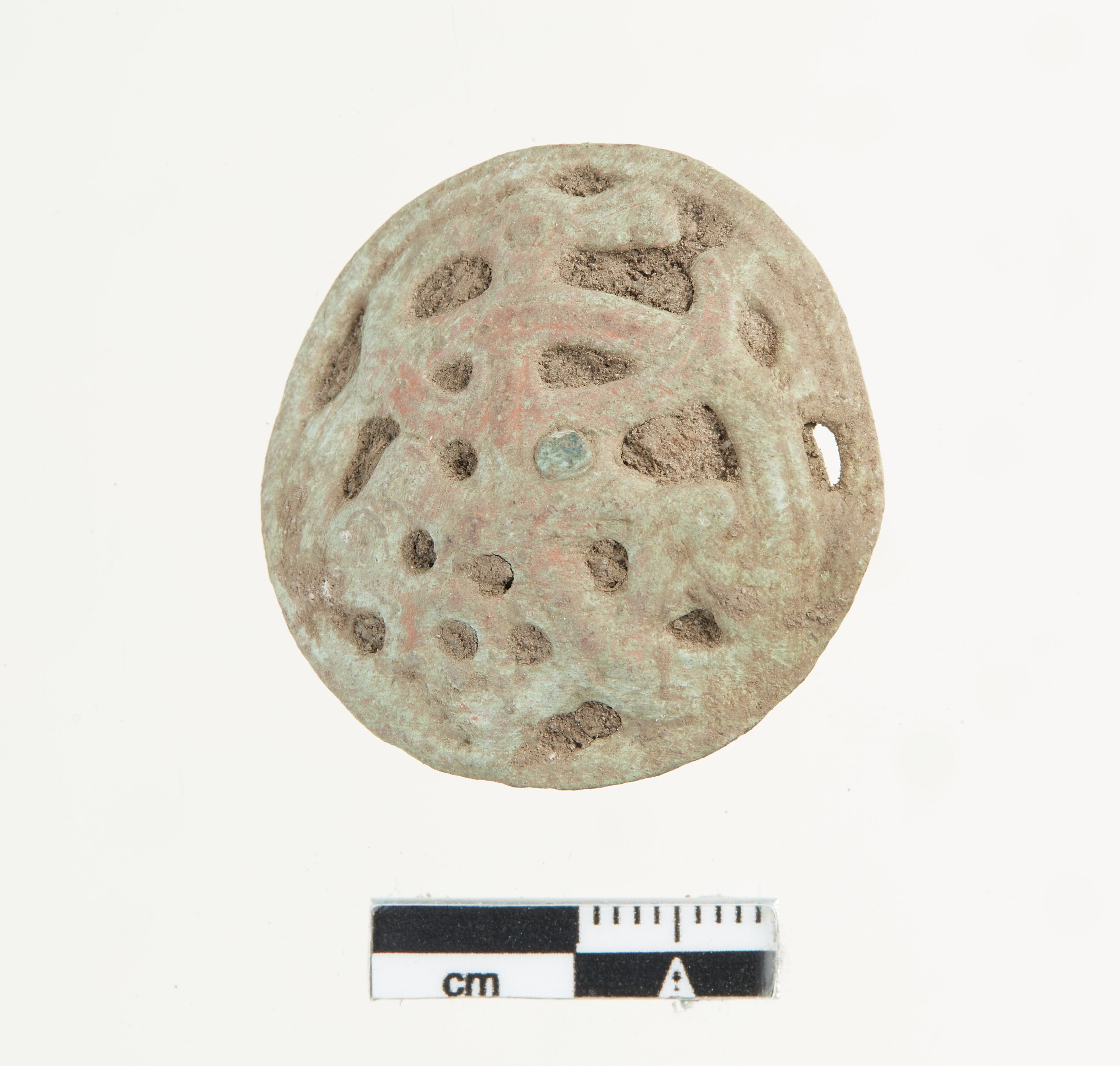 "En dobbeltskallet cirkulær pladefibula af bronze. Den øverste skal er dyreslyngsornamentik i gennembrudt arbejde. Dyret synes at være i Jellingestil. Der ses en central bronzenitte til montering af den yderste skal. Bevaret nålaenordning og rest af øsken."
