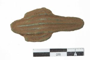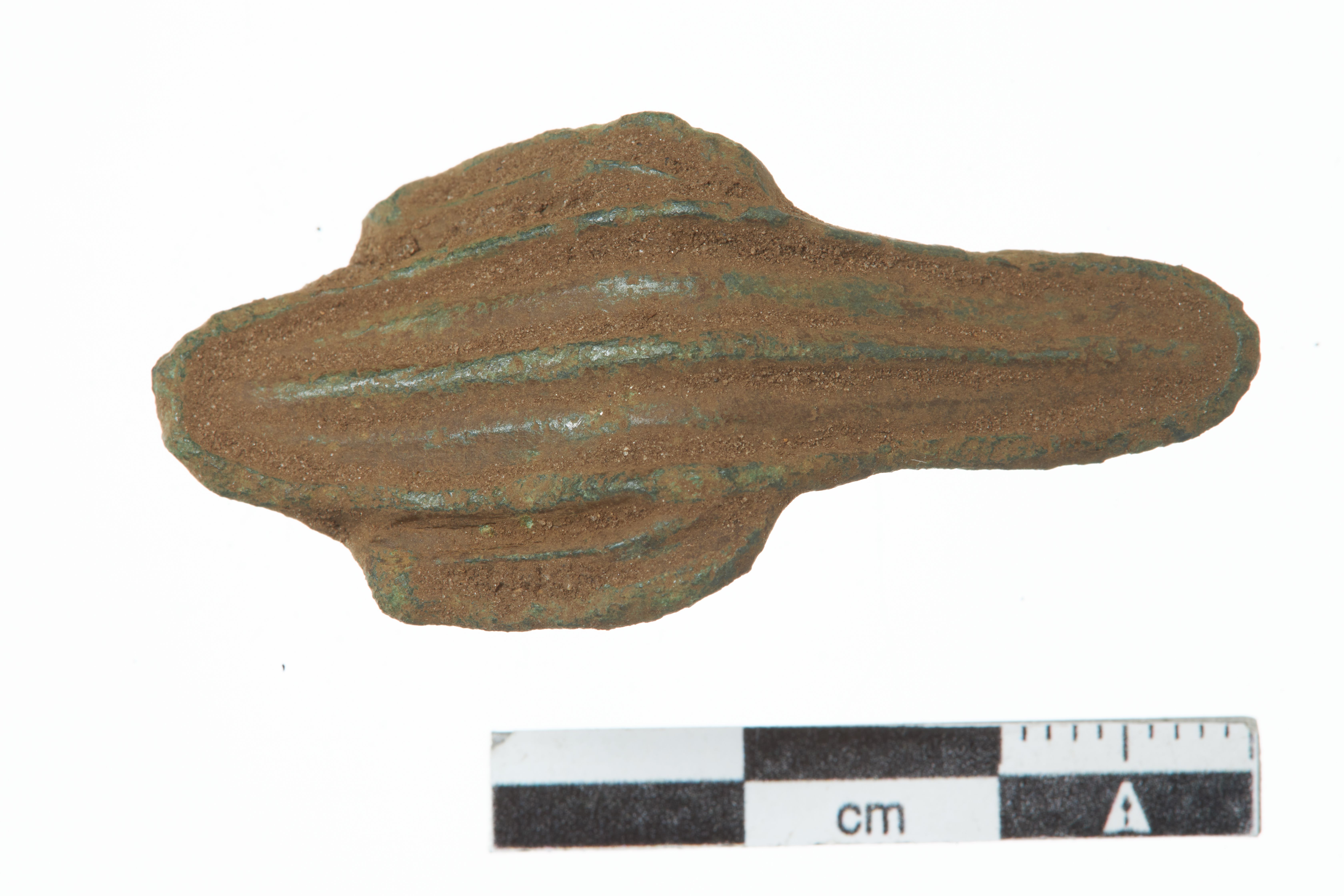 "Næbfibula af bronze ornamenteret med langsgående furer på hele oversiden. Nåleanordningen bevaret.",