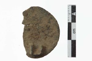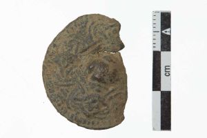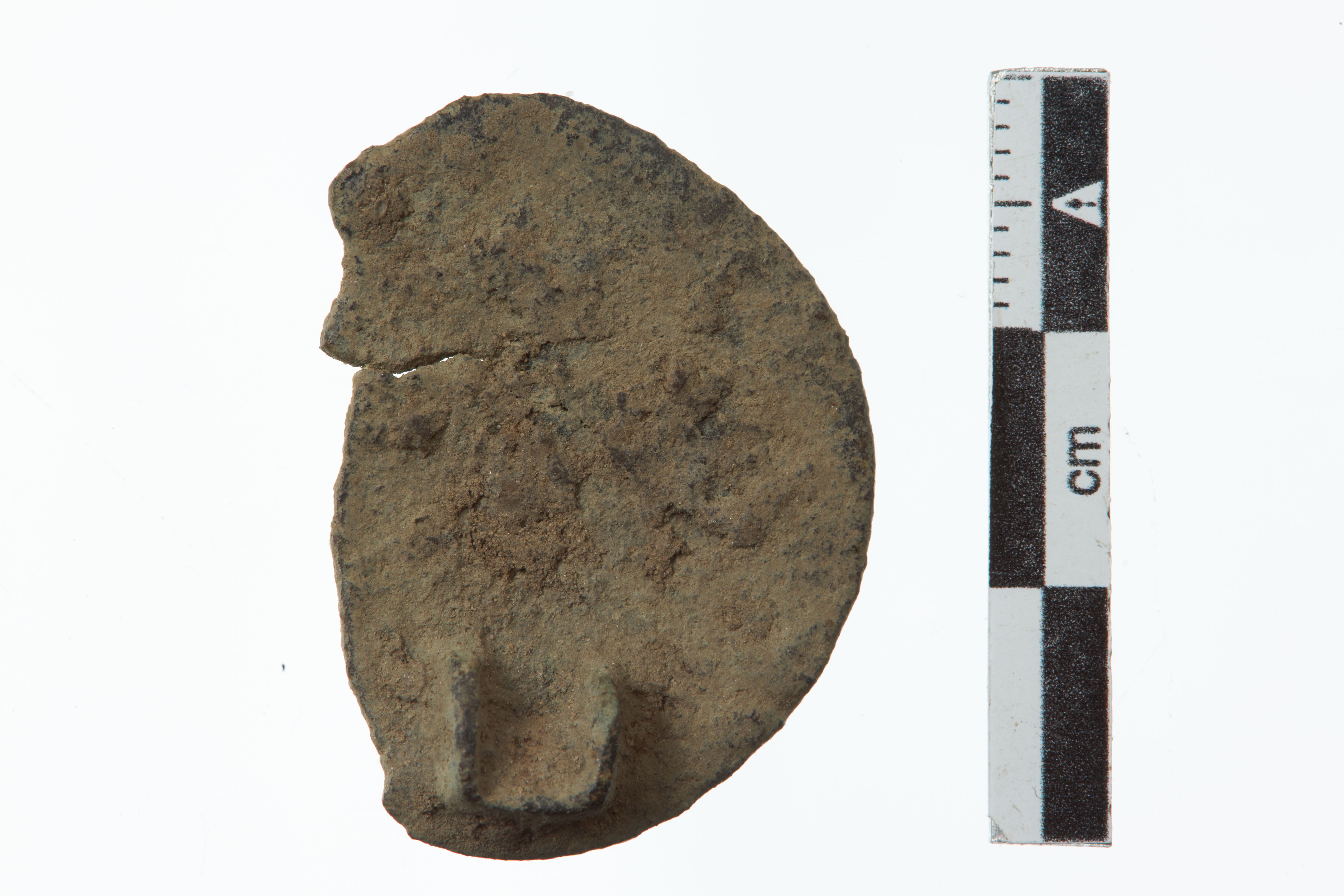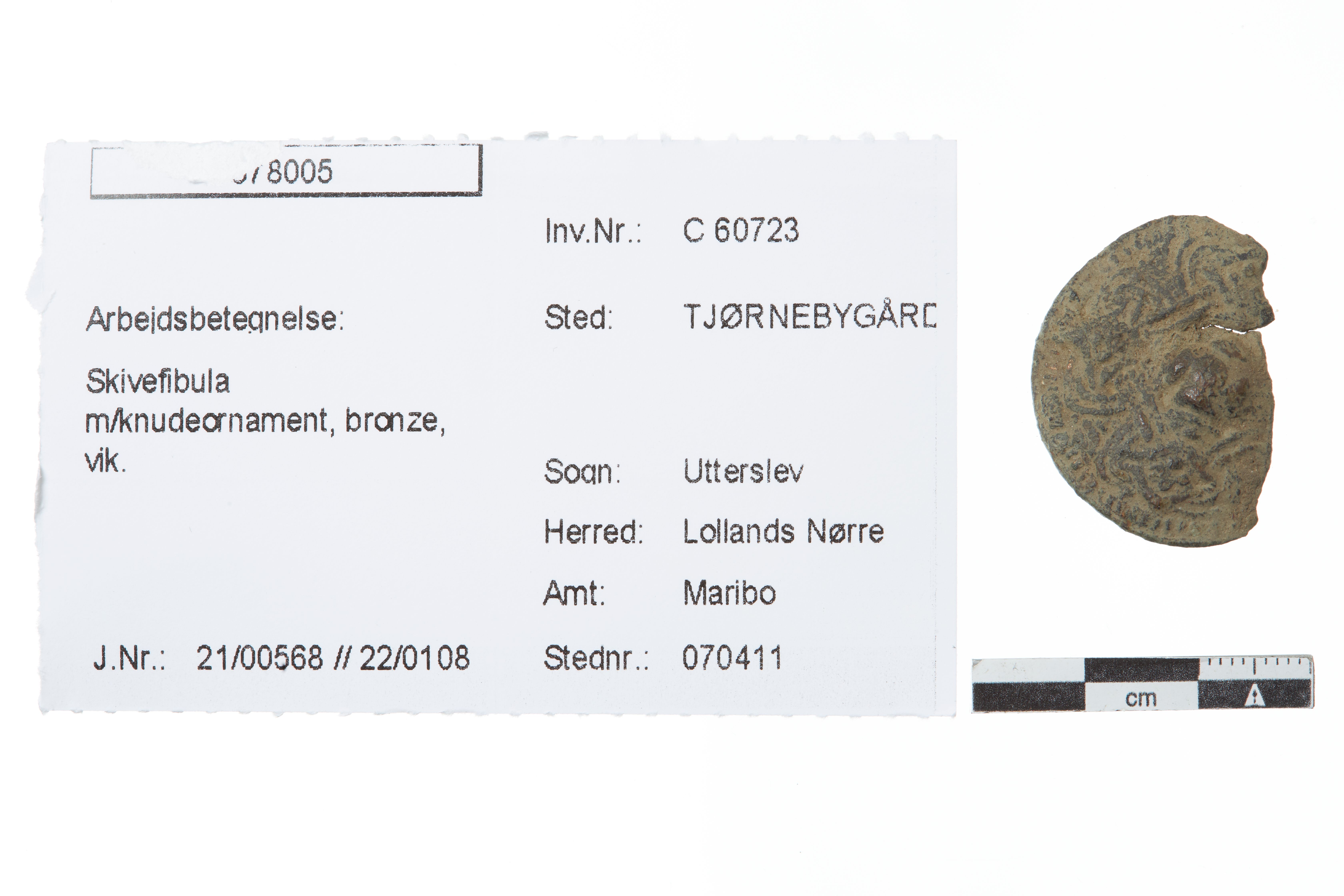 "Brudstykke af skivefibula med et firdelt knudemotiv omkring et centralt hævet bukkel i midten. På bagsiden ses rest af dobbelt nålebro."