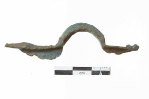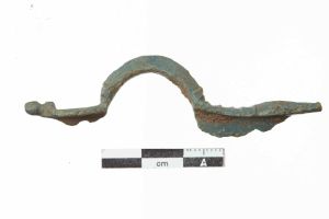 "Korsformet fibula af bronze med tagrygformet bøjle. Foden er udformet som et dyrehoved og ornamenteret med tværgående furer ved overgangen til bøjlen. Hovedpladen er rektangulær og kun én af tre knopper er bevaret. Rester af nålefæste og -holder bevaret.",
