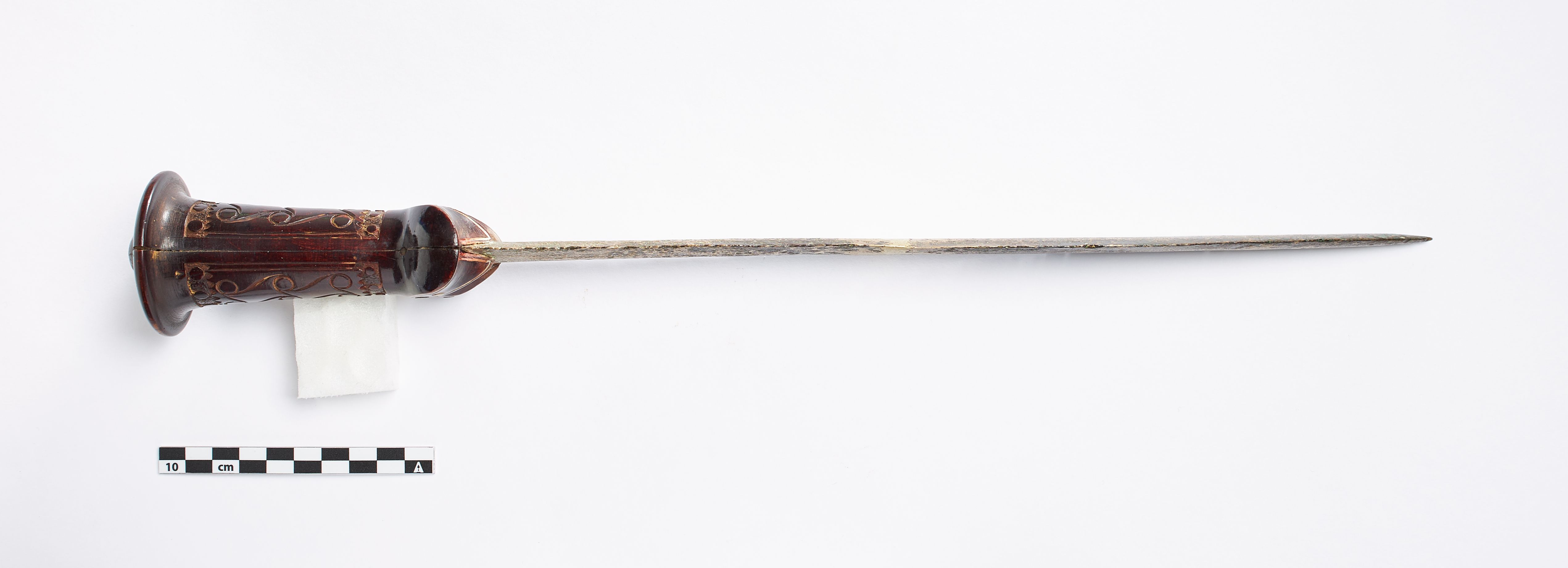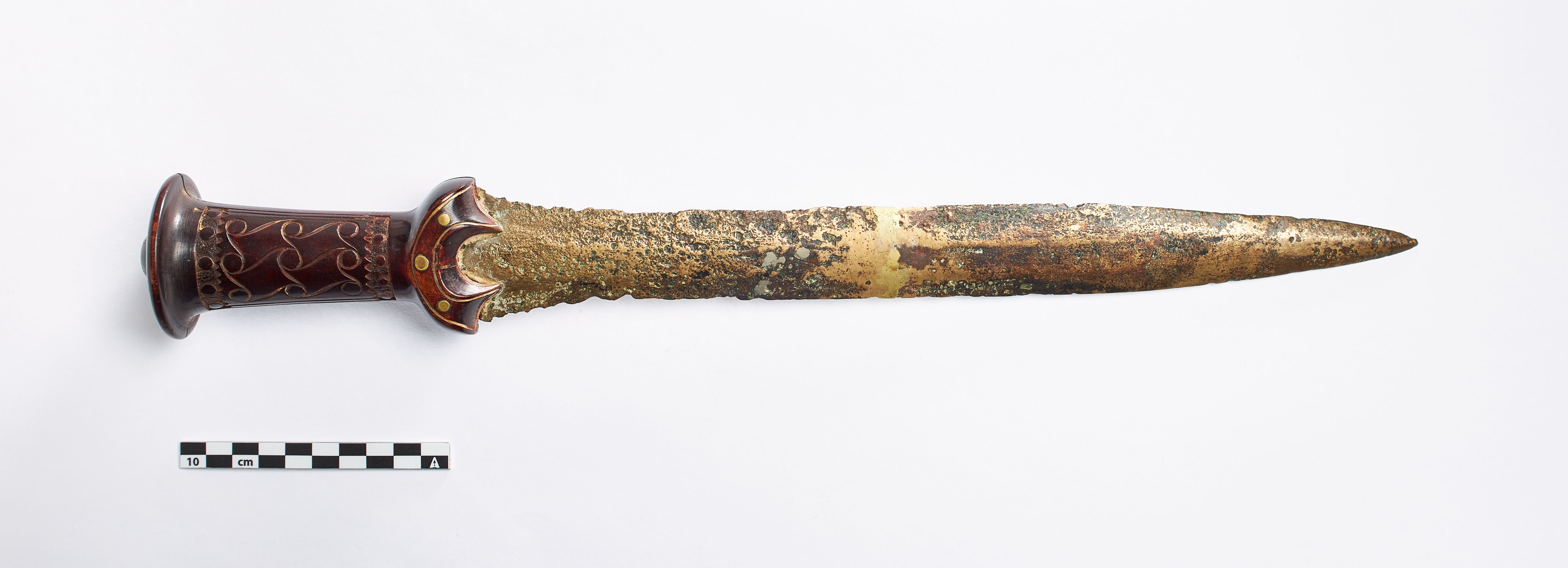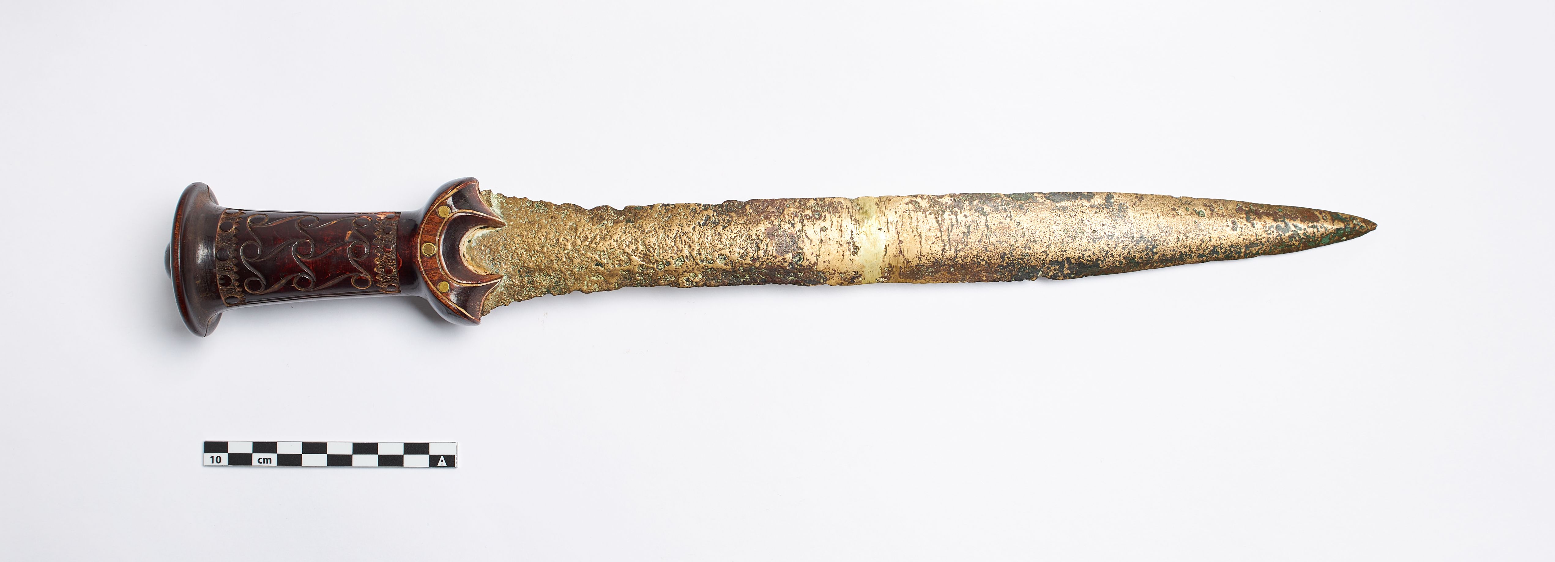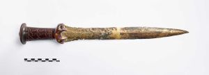 "Der er tale om klingen, som oprindeligt har været i to dele og nu er svejset sammen fra et kort sværd eller en dolk af grebspidstypen. Klingen har også fået påsat et nyt greb af træ, muligvis fastgjort med de originale nitter. Sværd af denne type kendes fra ældre bronzealder periode II-III og oprindeligt vil sværdet ligeledes have haft et greb af organisk materiale af ben eller træ med spiralornamentik."