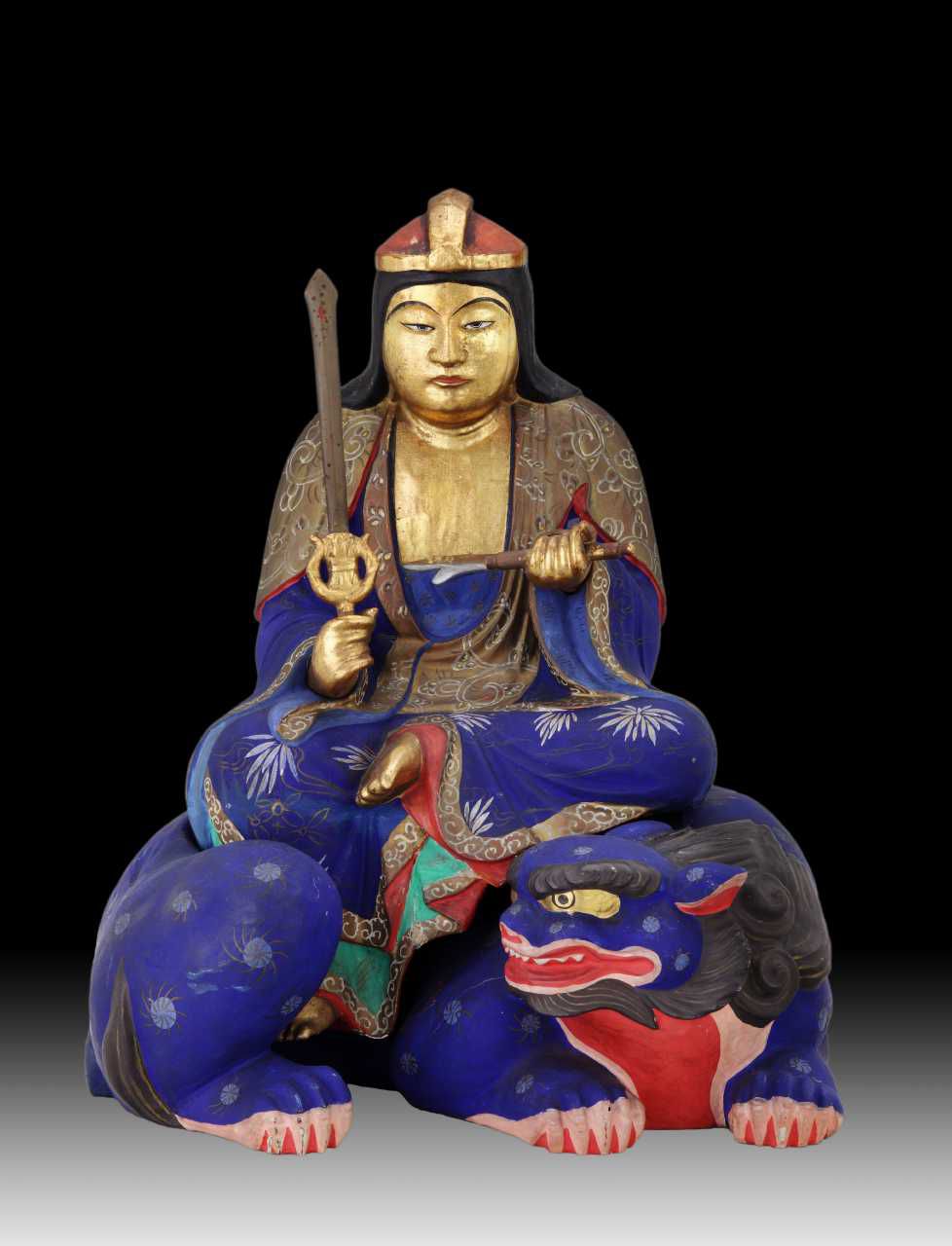 Figur af onju (Manjusri) visdommens Bodhisattva og vogter af den hellige lære siddende på en løve med et sværd og en skriftrulle. Figuren er udført i bemalet træ i stærke blå og røde farver, delvis forgyldt.