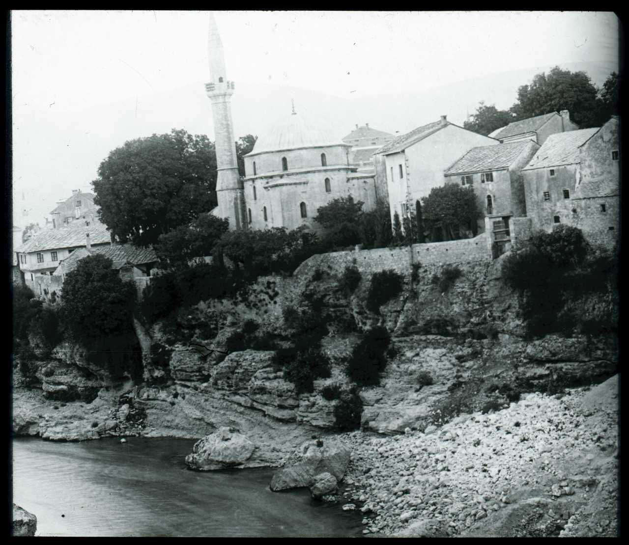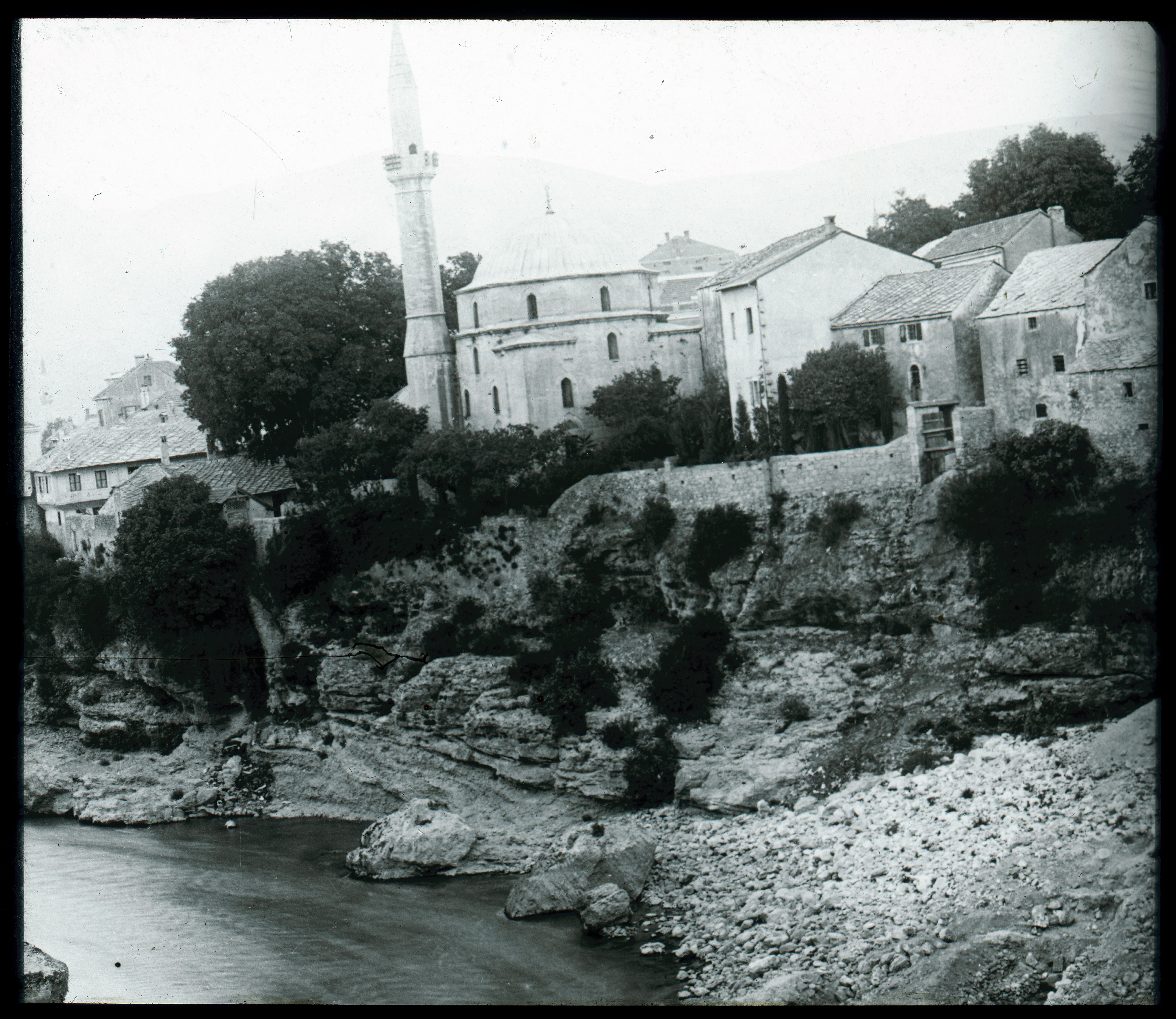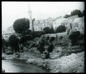 Sort/hvid fotografi. Diasset er placeret i en trææske med plads til 50 dias i størrelsen 8x8 cm. Æsken indeholder 38 glasdias, og har nummer D480. På æsken står skrevet: ”Jugoslavien”. I låget på æsken står fotografiernes titler skrevet under overskrifterne: ”Adelsberggrotten” "Cattaro" "Njegus" "Skutarisøen" "Cetinge" "Mosta" "Serajevo" "Beograd" "Nisk" "Split". Titlerne stemmer ikke altid overens med de pågældende fotografier.
