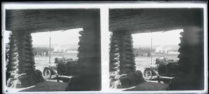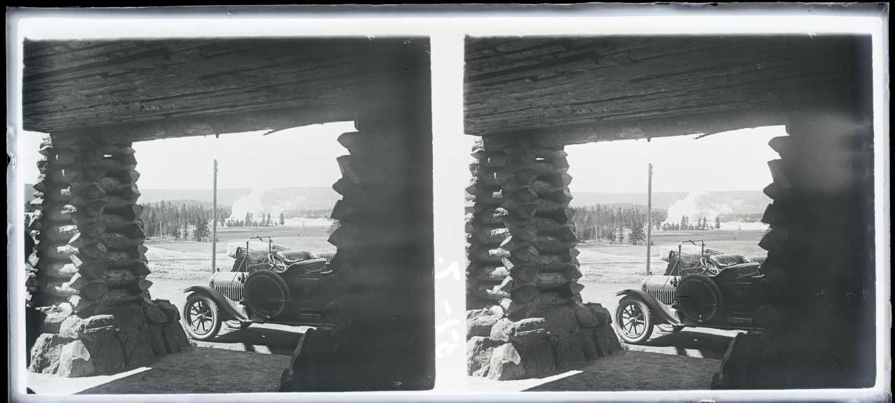 Stereoskopisk glasdias. Ligger i en æske med påskriften: "Yellowstone PArk. 51 %". På æsken er påklistret teksten: "Ilford Alpha Lantern Plates ". Æsken har nummer ”S121”.
